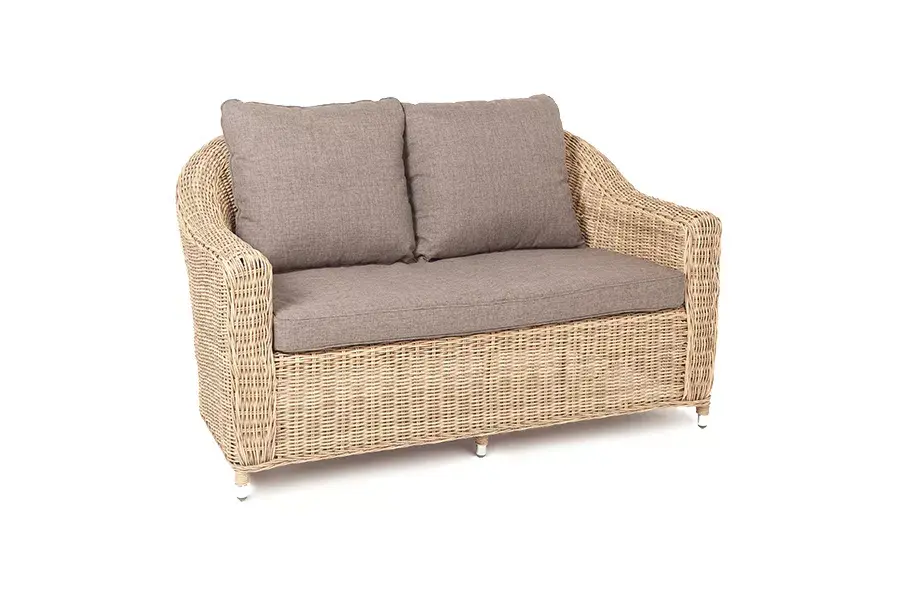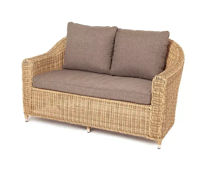 Диван из искусственного ротанга соломенного цвета «Кон Панна» дает возможность комфортно расположить две персоны благодаря комплектным подушкам из полиэстера с влагоотталкивающей пропиткой.