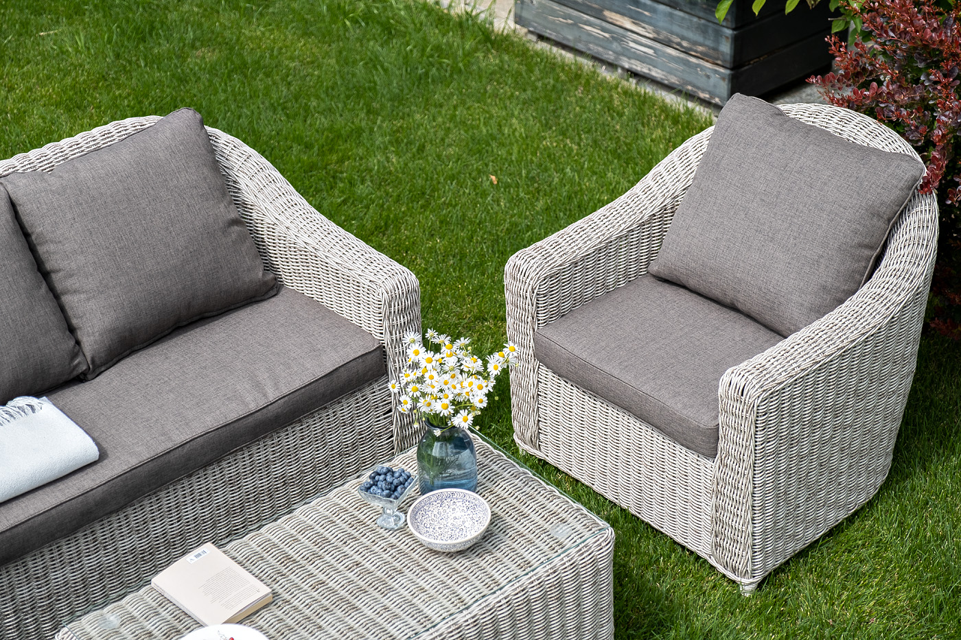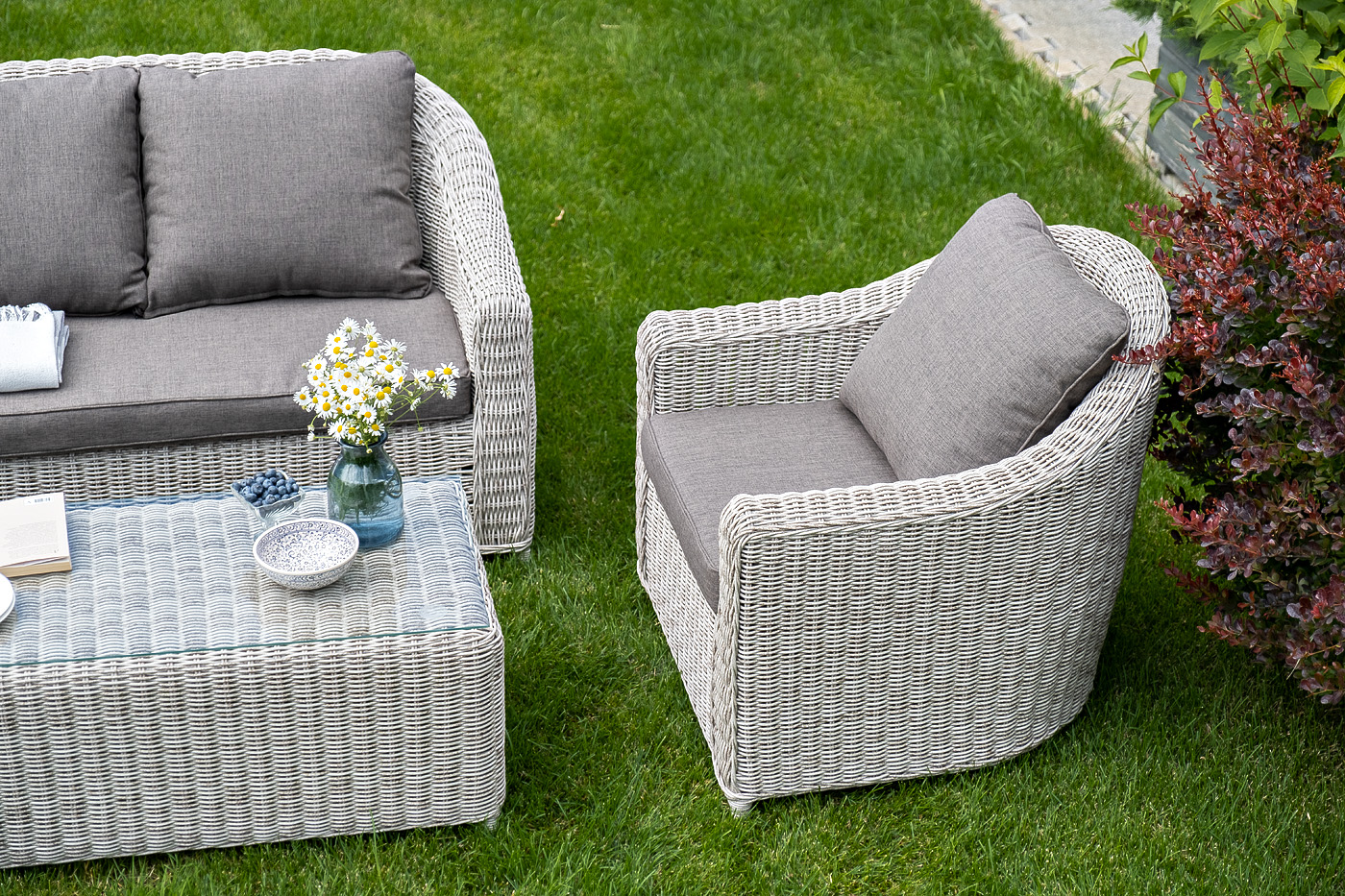 У кресла есть мягкие подушки, выполненые в сером цвете. Они сделаны из прочного полиэстера с плотностью 300гр/м2. Ткань имеет влагоотталкивающую пропитку, которая защищает ее от сильного намокания.