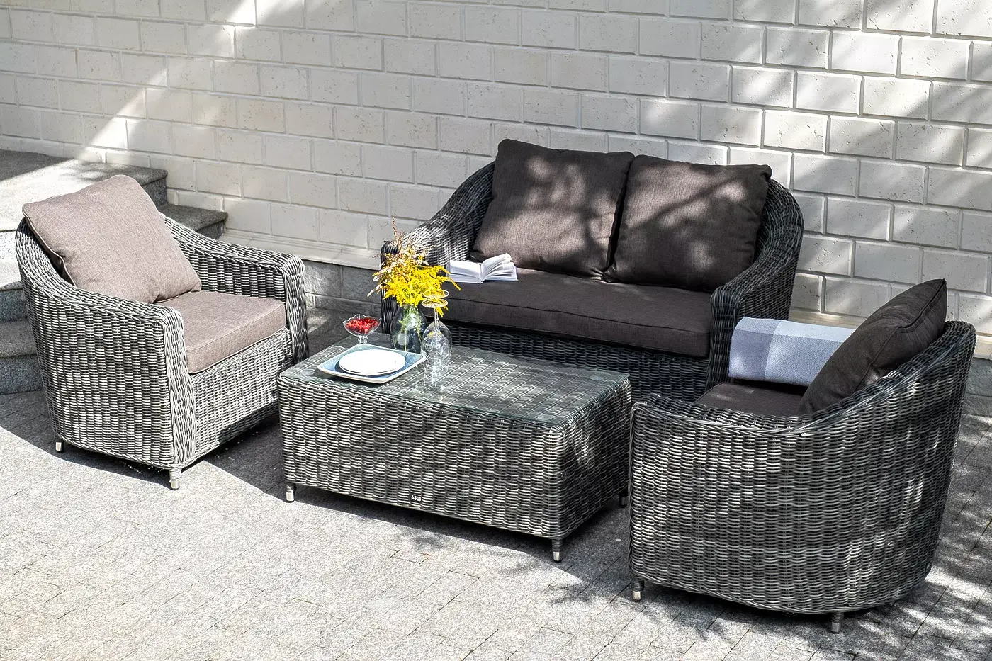 Размер модели – 800×800×800 мм. В качестве основы служит алюминиевый каркас, который оплетен круглым искусственным ротангом графитового оттенка.