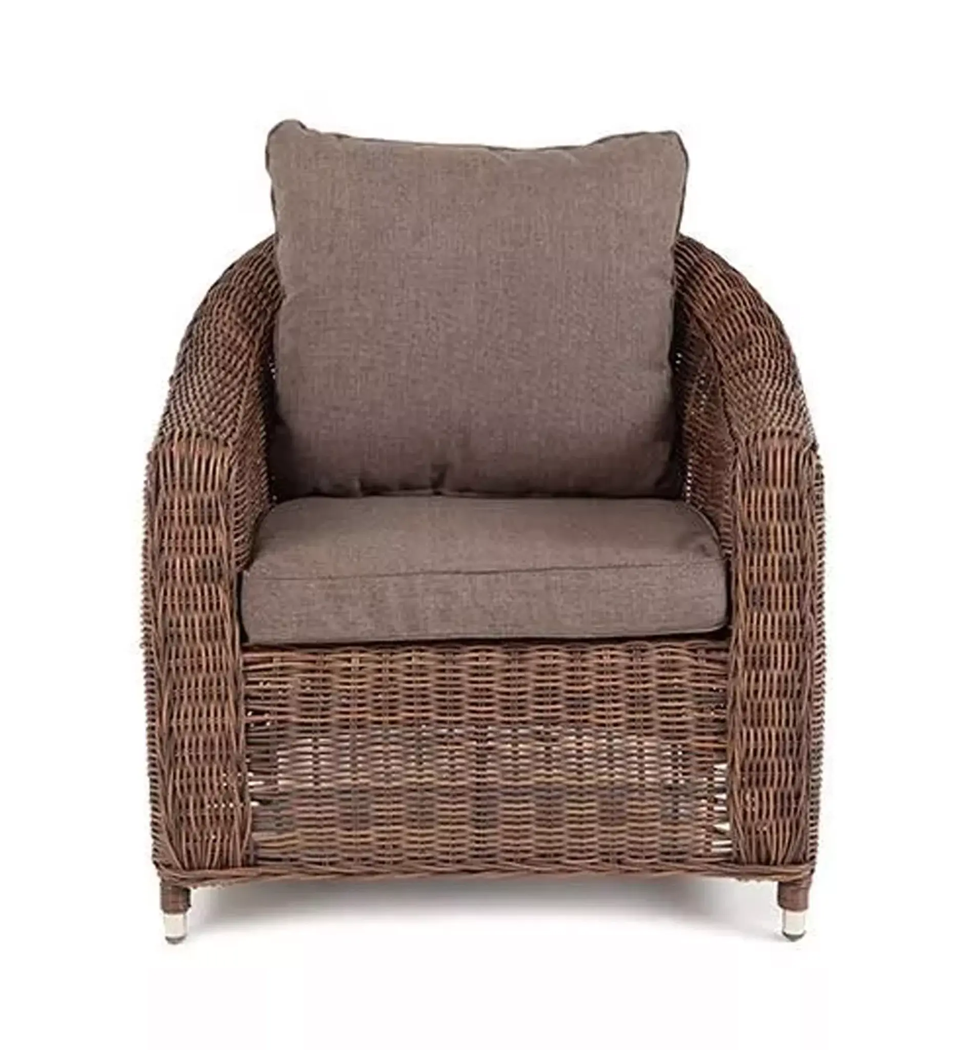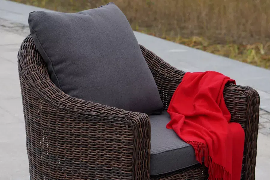 У кресла есть мягкие подушки, выполненые в серо-коричневом цвете. Они сделаны из прочного полиэстера с плотностью 230гр/м2. Ткань имеет влагоотталкивающую пропитку, которая защищает ее от сильного намокания.