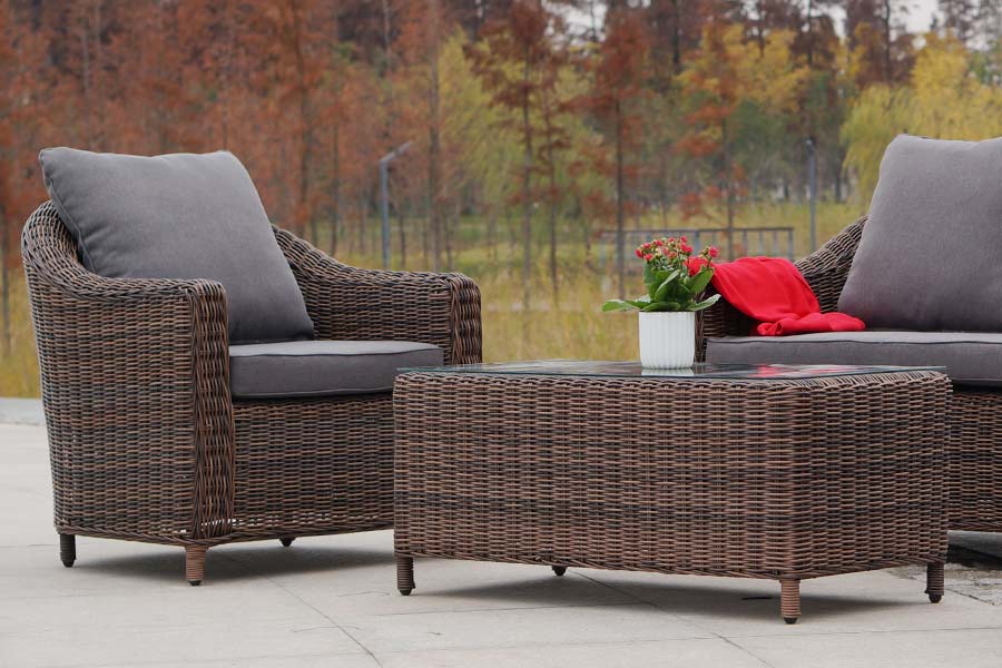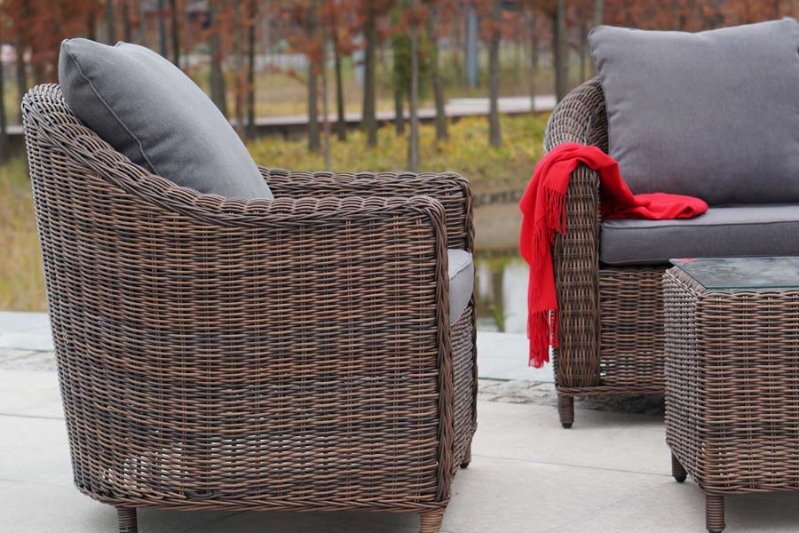 Садовая мебель выполнена из алюминиевого каркаса, выдерживающего большие нагрузки, и круглого искусственного ротанга. Каркас оплетен с помощью ручного метода и представлен в коричневом цвете.