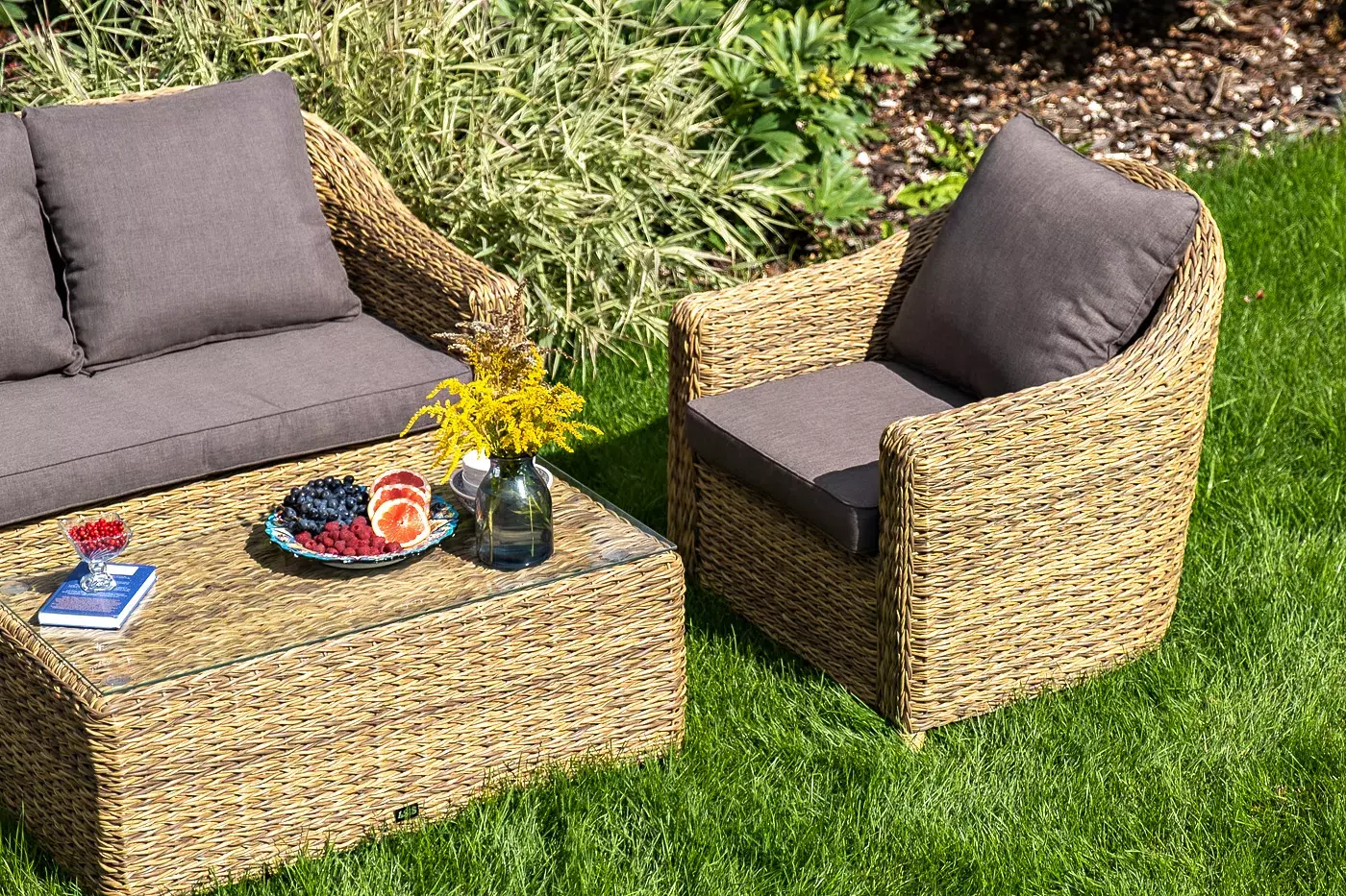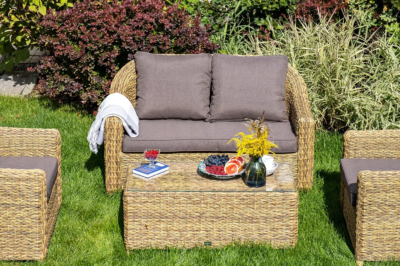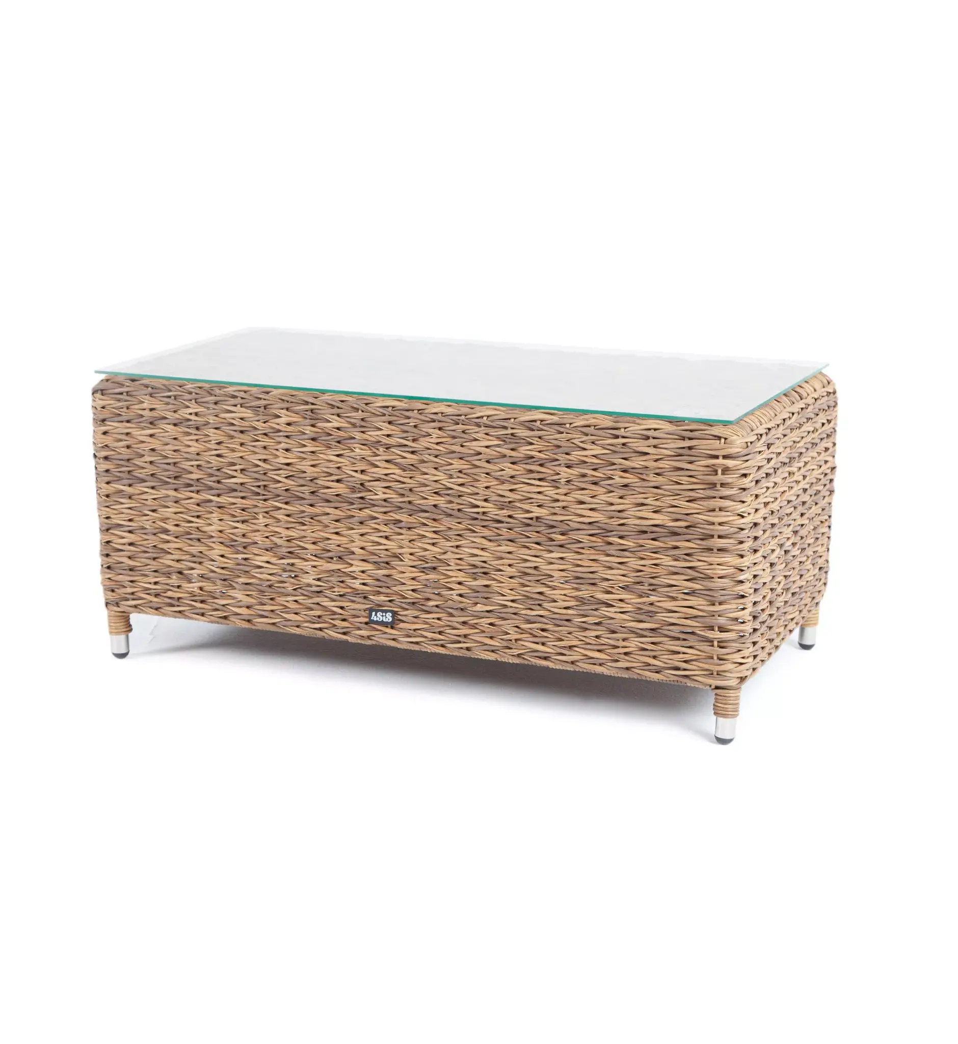 Журнальный столик из искусственного ротанга «Кон Панна» соломенного цвета, подходит для эксплуатации при различных погодных условиях. Вид плетения - "гиацинт".