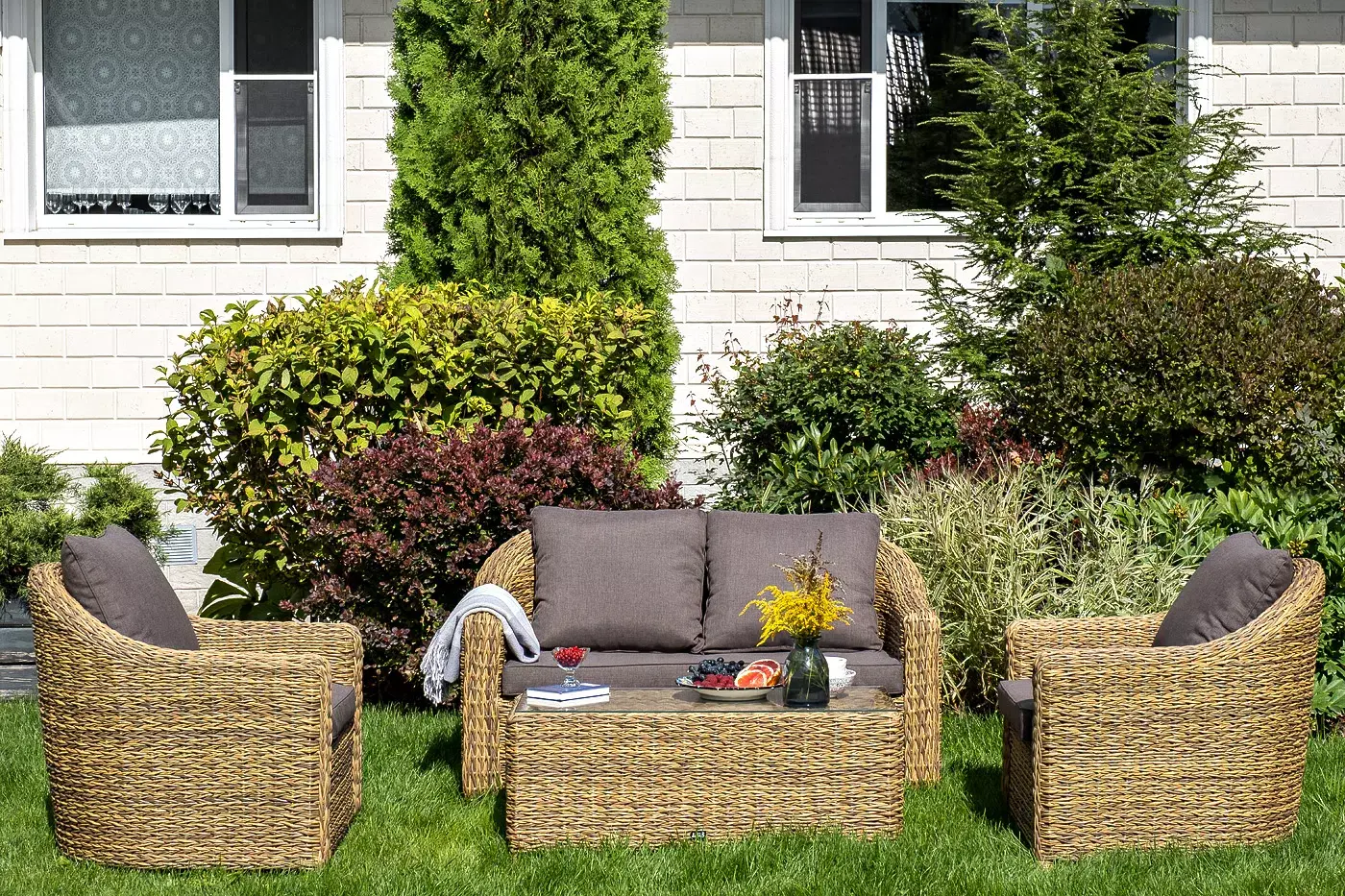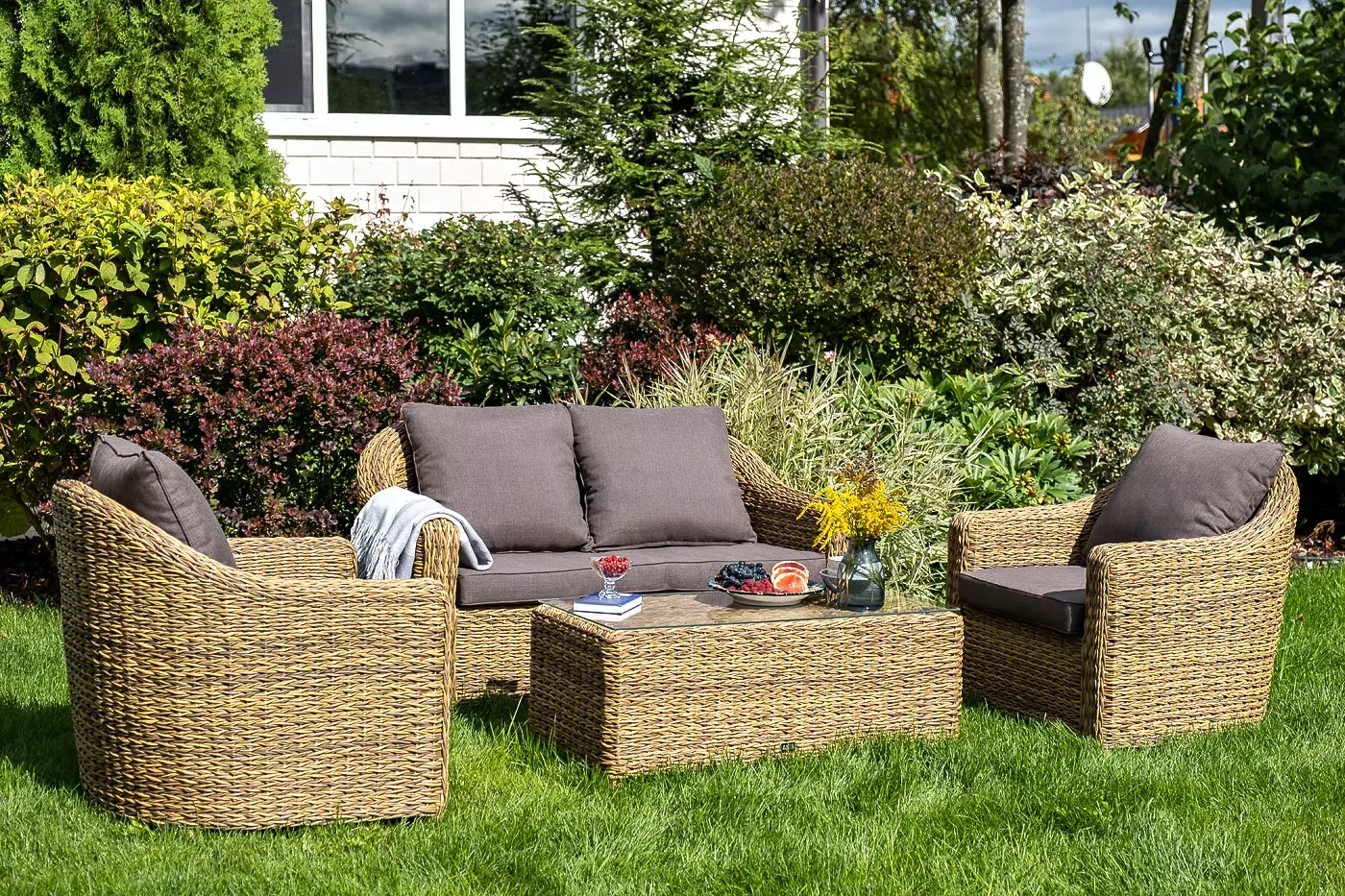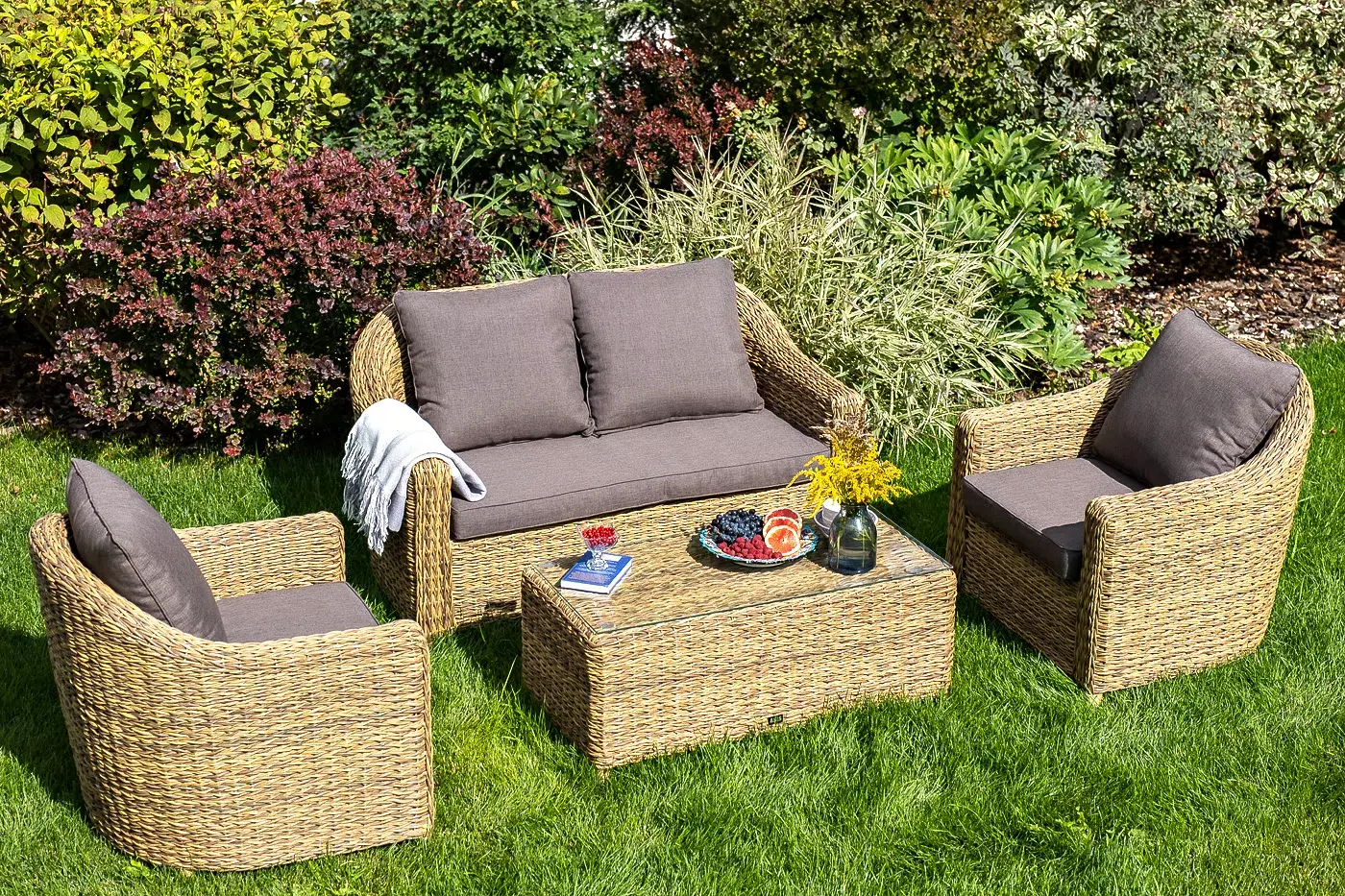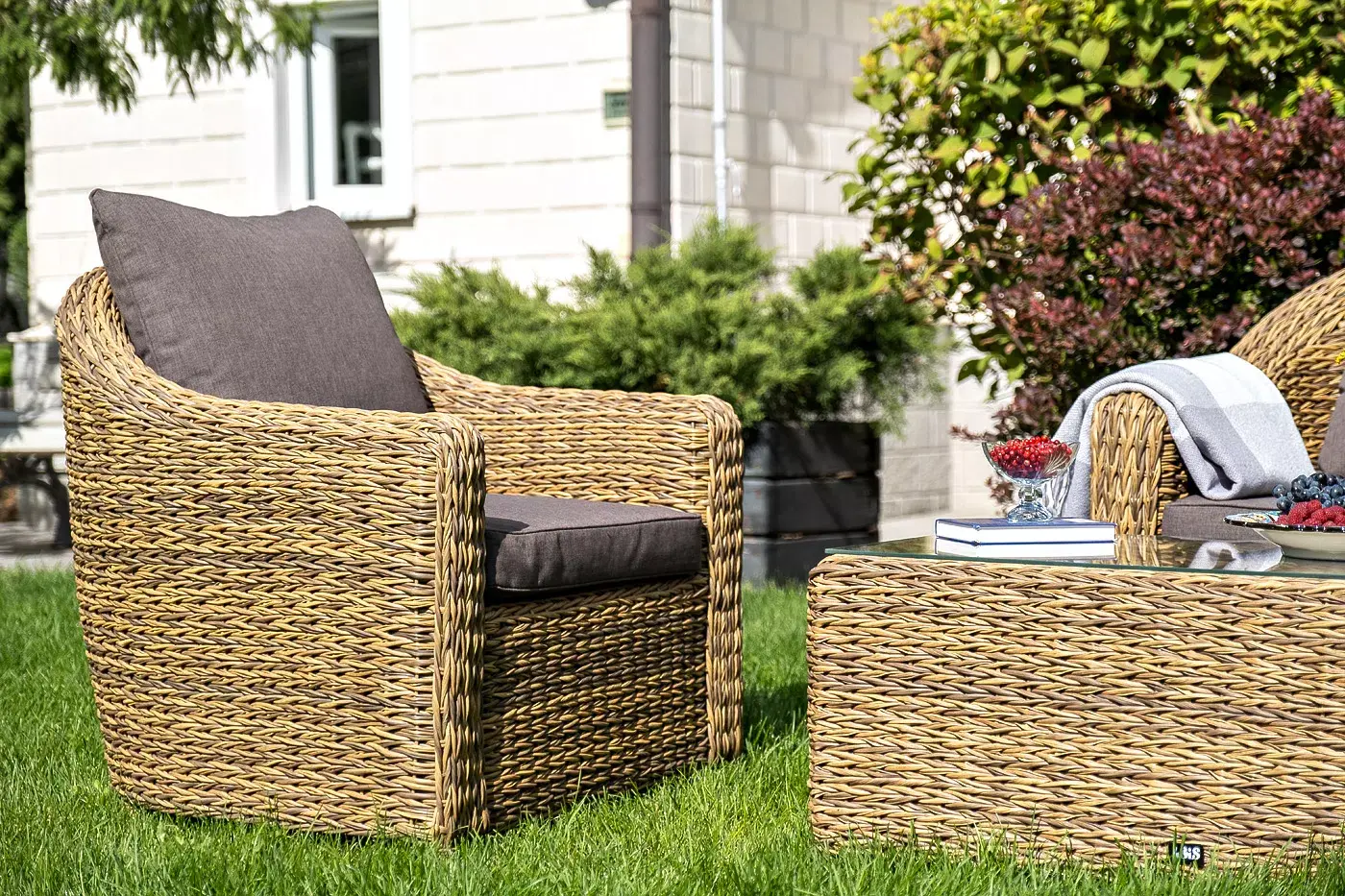 Журнальный столик из искусственного ротанга «Кон Панна» соломенного цвета, подходит для эксплуатации при различных погодных условиях. Вид плетения - "гиацинт".