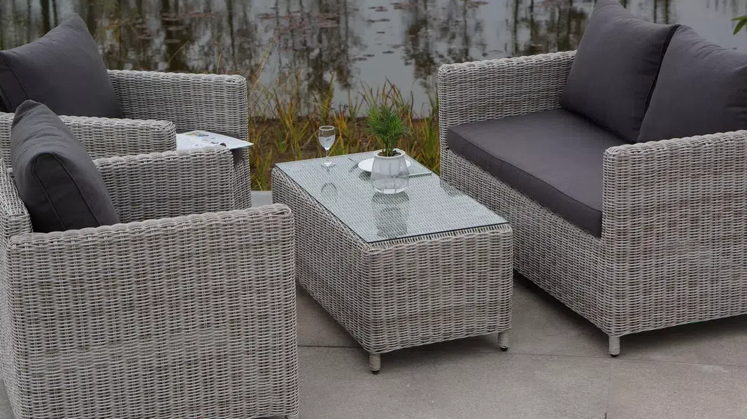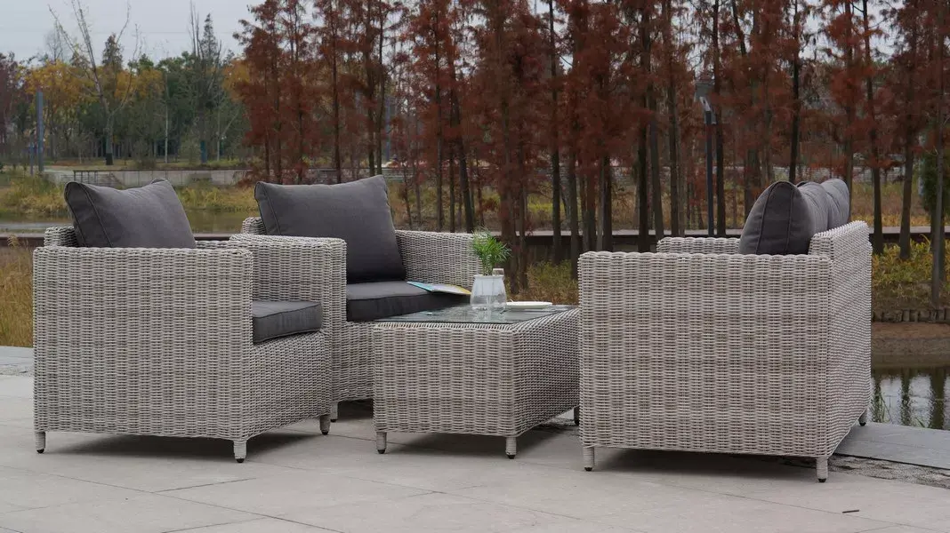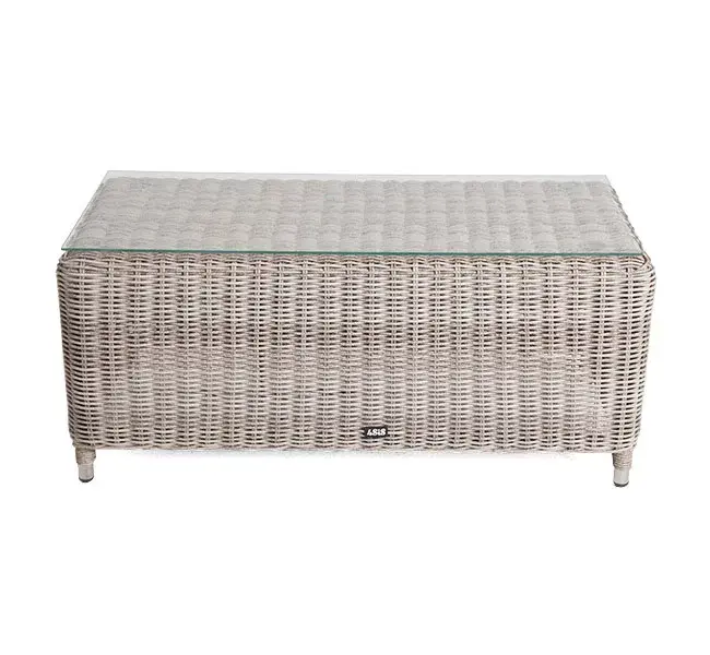 Журнальный столик «Кон Панна» изготовлен из алюминиевого каркаса, вручную оплетенного круглым искусственным ротангом бежевого оттенка.