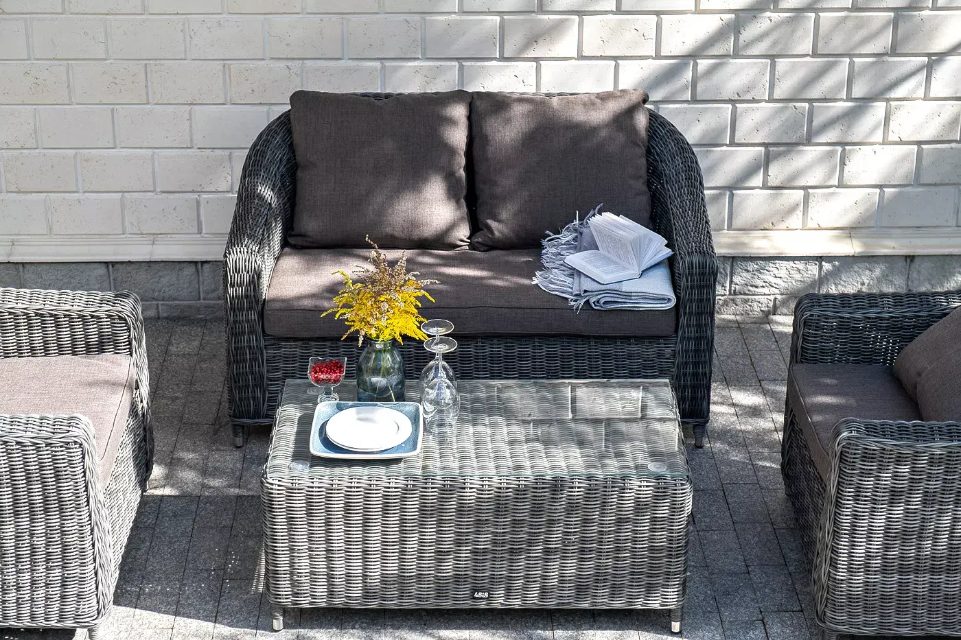 В основе мебели находится алюминиевый каркас высокой прочности. Декоративной составляющей является ручная круглая оплетка, которая выполнена из искусственного ротанга. Столик представлен в цвете "графит".