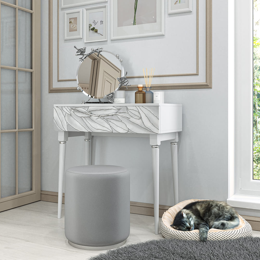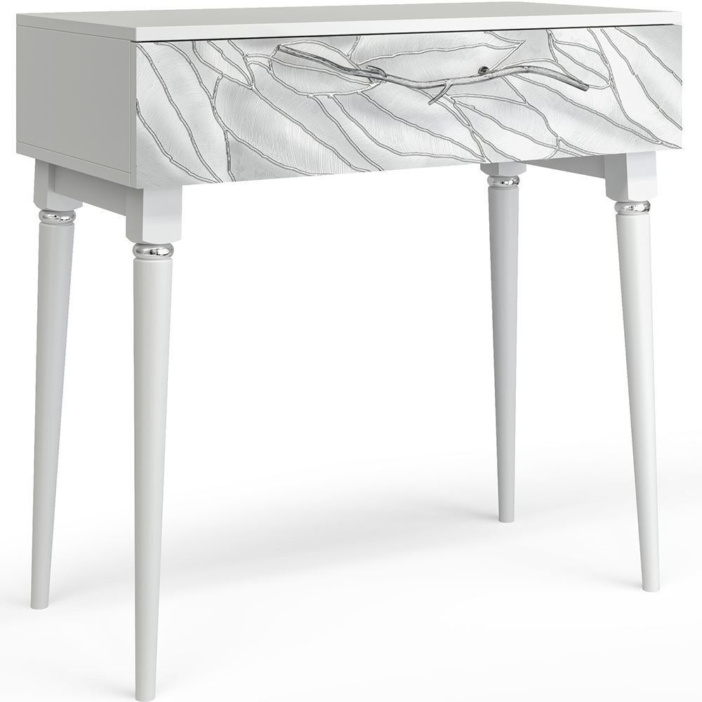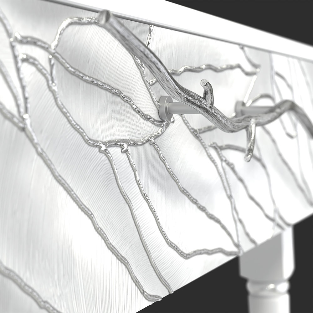 Универсальный консольный стол. Компактные габариты позволяют использовать стол в узком холле или небольшой комнате. Вместительный короб на доводчиках, легкая и бесшумная эксплуатация. Центральным элементом дизайна является кованная ручка в виде ветви дерева. Сочетание минималистичных форм и красота художественной ковки – придают консоли неповторимый шарм и стиль. Коллекция ARTЭффектная коллекция, которая украсит дом и с легкостью справится с задачей хранения. Современный минималистичный дизайн с неповторимым шармом элементов из ковки. Коллекция будет отлично смотреться в спальне, гостиной или прихожей благодаря актуальному оформлению и продуманным габаритам. Вдохновленная современными природными элементами в дизайне в сочетании с уникальными технологиями и теплотой ручной работы мастеров BOGACHO. Авторские принты на фасадах с серебряным патинированием, неповторимые кованые ручки, 3 варианта ножек на выбор под разные стилевые решения, позволяют выбрать дизайн, максимально подходящий под ваш интерьер: классика, стайл, сканди. Коллекция ART от BOGACHO HOME DESIGN - сделайте свой дом ярче, как давно мечтали!