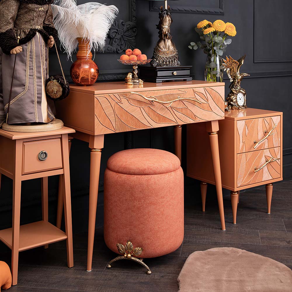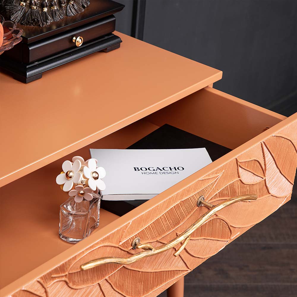 Консольный столик Арт-классик – от российской фабрики мебели BOGACHO, эффектный предмет интерьера, который позволит создать в вашем доме изысканную обстановку. Консоль можно разместить в любой комнате дома, она гармонично будет смотреться в классическом интерьере, лофт, скандинавский стиль Икеа. Эстетика и оригинальный дизайнОбладая оригинальным авторским дизайном, прикроватный столик выделяется оригинальным фасадом. Изюминка изделия – шикарная кованая ручка в форме ветви дерева – ручная работа кузнеца. За изящную ручку удобно открывать и закрывать выдвижной ящик консольного столика. Фасад украшен тропическими листьями из мраморной пудры в технике мастихиновой живописи.Модель мебели в спальню снабжена качественной фурнитурой, которая обеспечивает плавный ход выдвижного механизма на долгие годы. Материалом изготовления изделия служит Мдф. Декоративные элементы отлиты из коелгинского мрамора, отшлифованы, а затем позолочены вручную. ФункциональностьТуалетный стол с ящиком. А это значит, что вы сможете использовать ее как систему хранения вещей и документов, косметики (стол для макияжа, гримерный) или она подойдет как тумба под телевизор. Вместительный ящик незаменим для того, чтобы наполнить его тем, что должно быть всегда под рукой, в легком доступе. Дополнив его зеркалом, вы устроите себе идеальное место для нанесения ежедневного макияжа и ритуалов красоты. Мебель подойдет как тумба в спальню для девочек, тумба под Тв. КомпактностьКосметический стол может быть установлен в любом удобном для вас месте. Трюмо женское не отнимает пространства, напротив, экономит его, выглядит очень красиво, современно и стильно. Используйте его как мебель в спальню, туалетный столик с зеркалом – за ним удобно сидеть, и он не занимает много места, при этом позволит хранить в ящике все нужные принадлежности. Используйте как мебель для гостиной, на нем удобно расположить ноутбук, светильник или декор.Можно купить тумбу для гостиниц, отелей, загородных домов, коттеджей. Она украсит интерьер и станет незаменимой мебелью для полной комплектации как квартир, так и номеров. Практичность и простота уходаКонсоль в прихожую изготовлена из высококачественного Мдф. Покрытие износостойкое, не требует особого ухода. Достаточно протереть поверхность слегка влажной тряпочкой. Ручка выполнена из кованой стали. Единый стильЛюбите, чтобы интерьер был в едином стиле? Присмотритесь к другой мебели фабрики BOGACHO из коллекции Арт, которая будет гармонично сочетаться друг с другом.