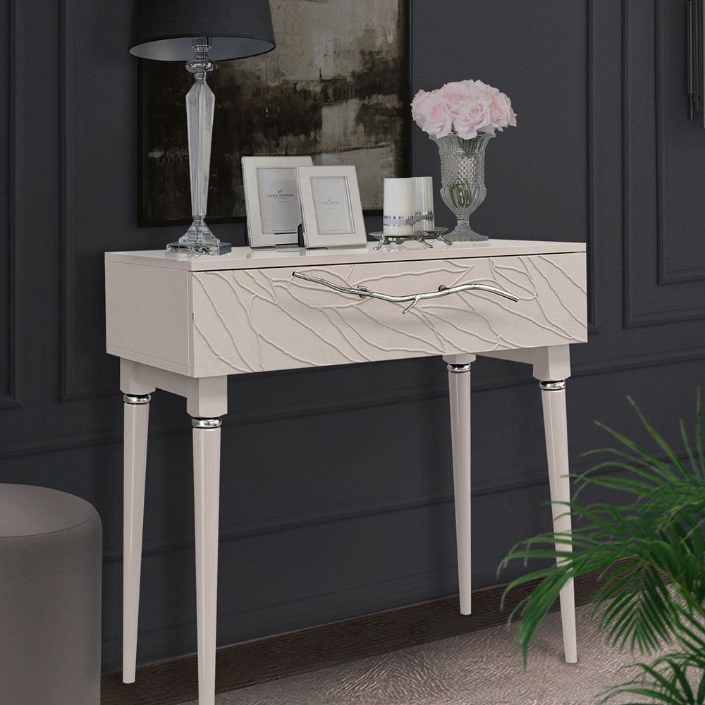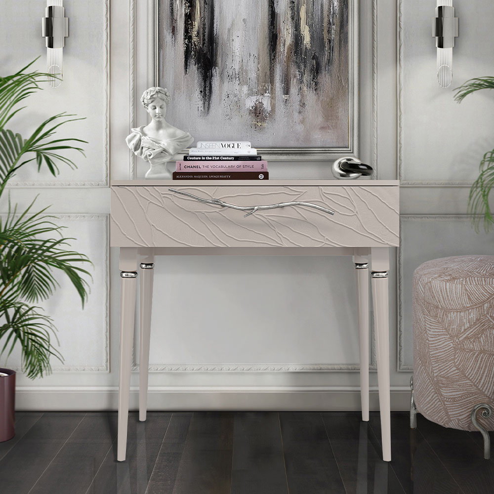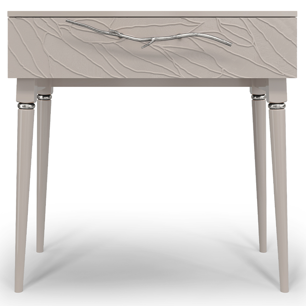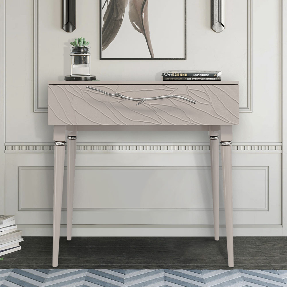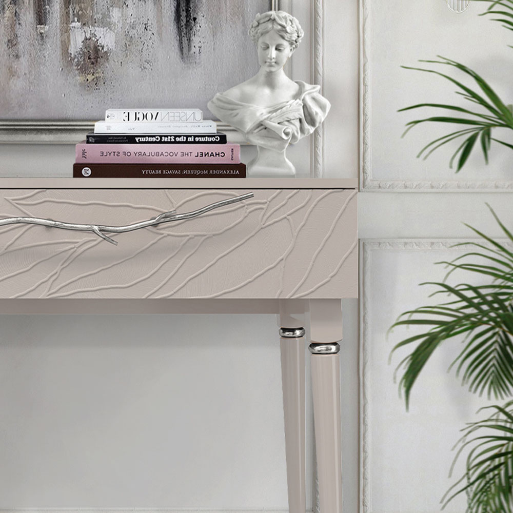 Консольный столик Арт-классик – от российской фабрики мебели BOGACHO, эффектный предмет интерьера, который позволит создать в вашем доме изысканную обстановку. Консоль можно разместить в любой комнате дома, она гармонично будет смотреться в классическом интерьере, лофт, скандинавский стиль. Эстетика и оригинальный дизайнОбладая оригинальным авторским дизайном, прикроватный столик выделяется оригинальным фасадом. Изюминка изделия – шикарная кованая ручка в форме ветви дерева – ручная работа кузнеца. За изящную ручку удобно открывать и закрывать выдвижной ящик консольного столика. Фасад украшен тропическими листьями из мраморной пудры в технике мастихиновой живописи.Модель мебели в спальню снабжена качественной фурнитурой, которая обеспечивает плавный ход выдвижного механизма на долгие годы. Материалом изготовления изделия служит Мдф. Декоративные элементы отлиты из коелгинского мрамора, отшлифованы, а затем позолочены вручную. ФункциональностьТуалетный стол с ящиком. А это значит, что вы сможете использовать ее как систему хранения вещей и документов, косметики (стол для макияжа, гримерный) или она подойдет как тумба под телевизор. Вместительный ящик незаменим для того, чтобы наполнить его тем, что должно быть всегда под рукой, в легком доступе. Дополнив его зеркалом, вы устроите себе идеальное место для нанесения ежедневного макияжа и ритуалов красоты. Мебель подойдет как тумба в спальню для девочек, тумба под Тв. КомпактностьКосметический стол может быть установлен в любом удобном для вас месте. Трюмо женское не отнимает пространства, напротив, экономит его, выглядит очень красиво, современно и стильно. Используйте его как мебель в спальню, туалетный столик с зеркалом – за ним удобно сидеть, и он не занимает много места, при этом позволит хранить в ящике все нужные принадлежности. Используйте как мебель для гостиной, на нем удобно расположить ноутбук, светильник или декор.Можно купить тумбу для гостиниц, отелей, загородных домов, коттеджей. Она украсит интерьер и станет незаменимой мебелью для полной комплектации как квартир, так и номеров. Практичность и простота уходаКонсоль в прихожую изготовлена из высококачественного Мдф. Покрытие износостойкое, не требует особого ухода. Достаточно протереть поверхность слегка влажной тряпочкой. Ручка выполнена из кованой стали. Единый стильЛюбите, чтобы интерьер был в едином стиле? Присмотритесь к другой мебели фабрики BOGACHO из коллекции Арт, которая будет гармонично сочетаться друг с другом.
