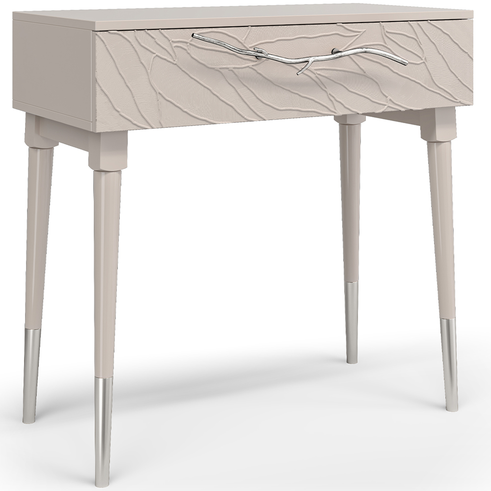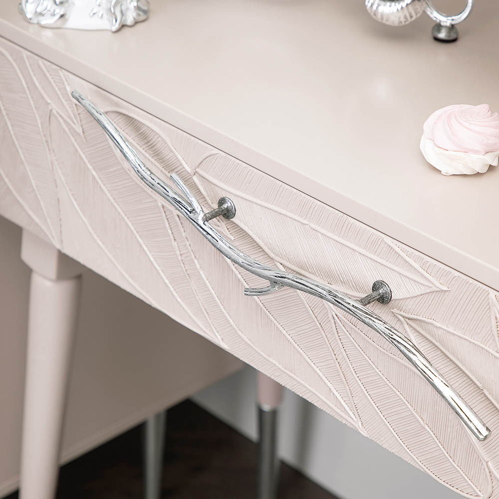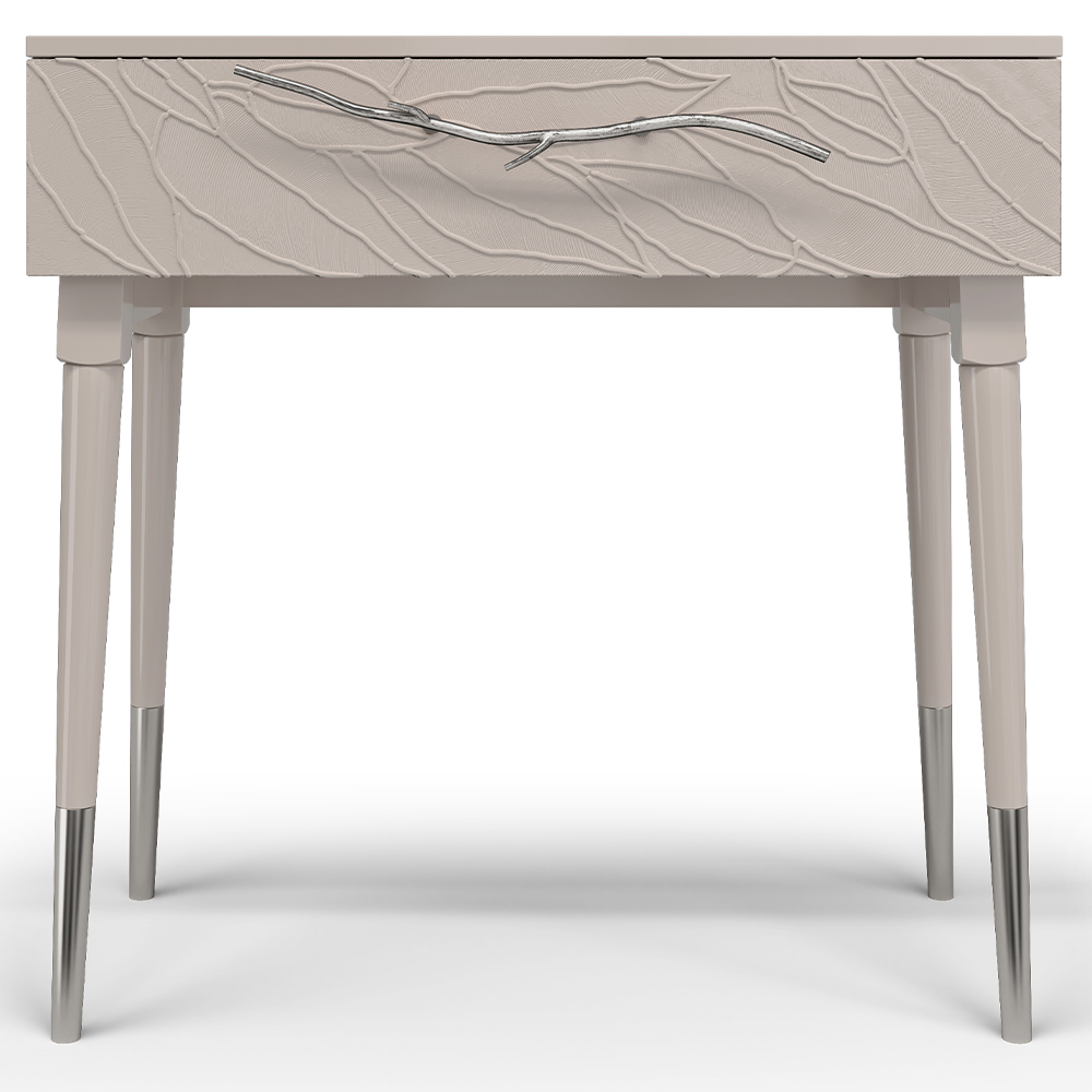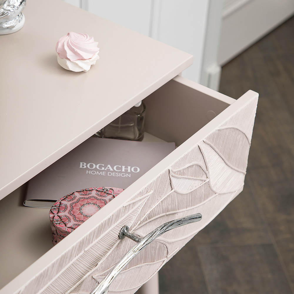 Эстетика и оригинальный дизайнОбладая оригинальным авторским дизайном, прикроватный столик выделяется оригинальным фасадом. Изюминка изделия – шикарная кованая ручка в форме ветви дерева – ручная работа кузнеца. За изящную ручку удобно открывать и закрывать выдвижной ящик консольного столика. Фасад украшен тропическими листьями из мраморной пудры в технике мастихиновой живописи.Модель мебели в спальню снабжена качественной фурнитурой, которая обеспечивает плавный ход выдвижного механизма на долгие годы. Материалом изготовления изделия служит Мдф. Декоративные элементы отлиты из коелгинского мрамора, отшлифованы, а затем позолочены вручную.