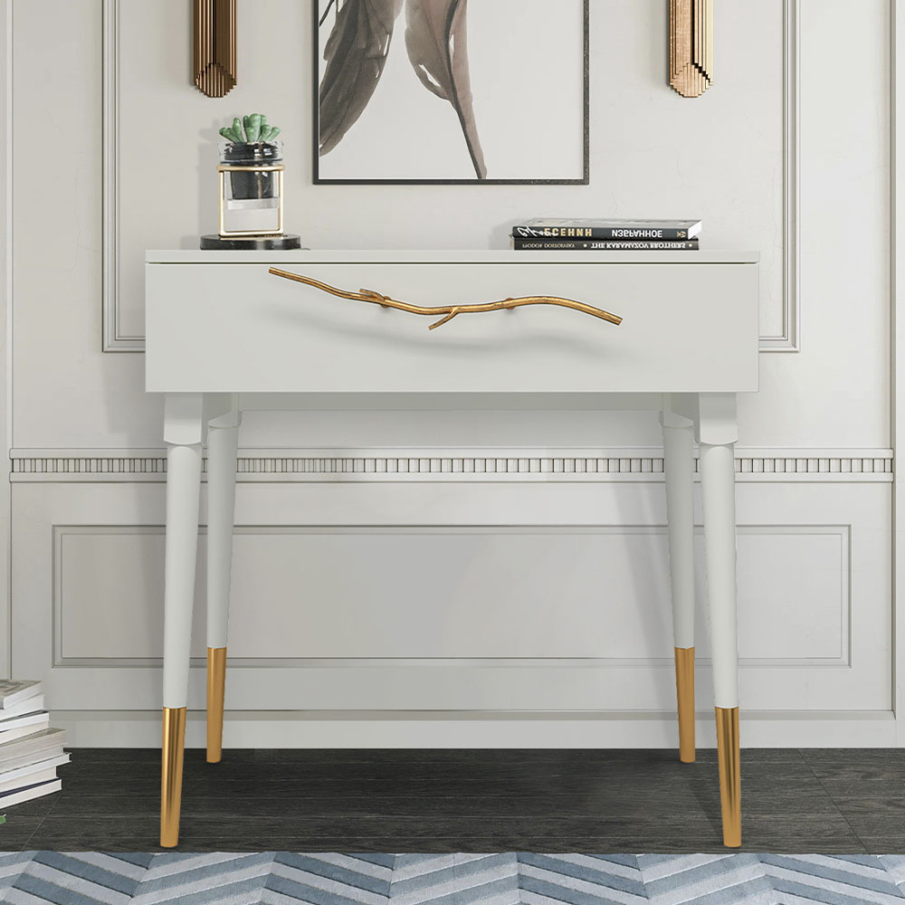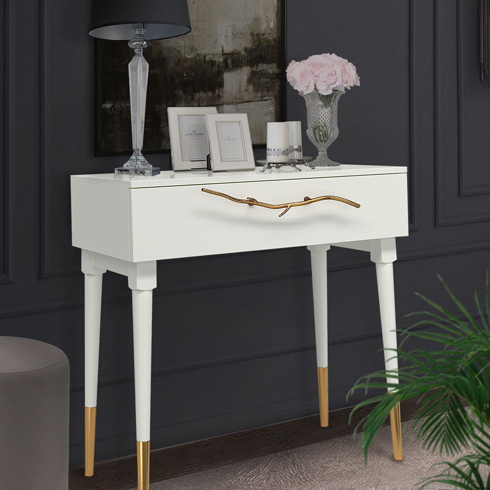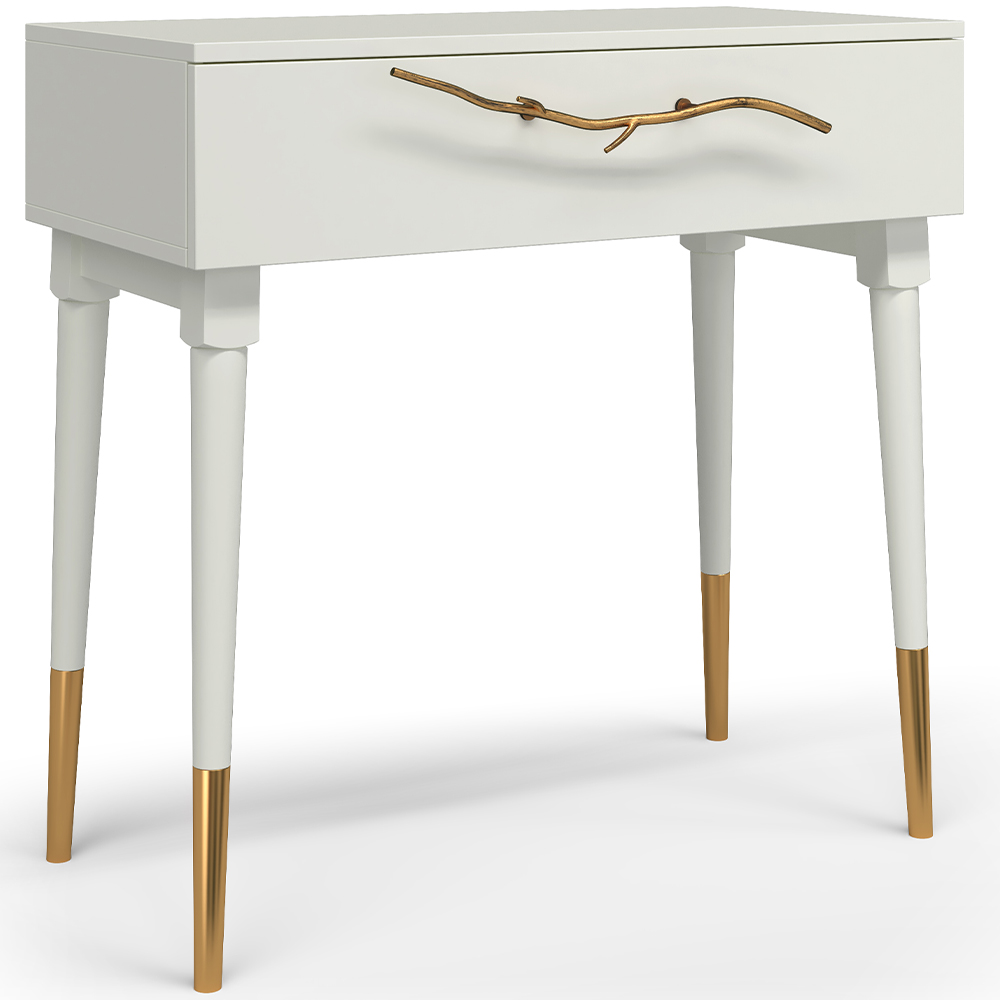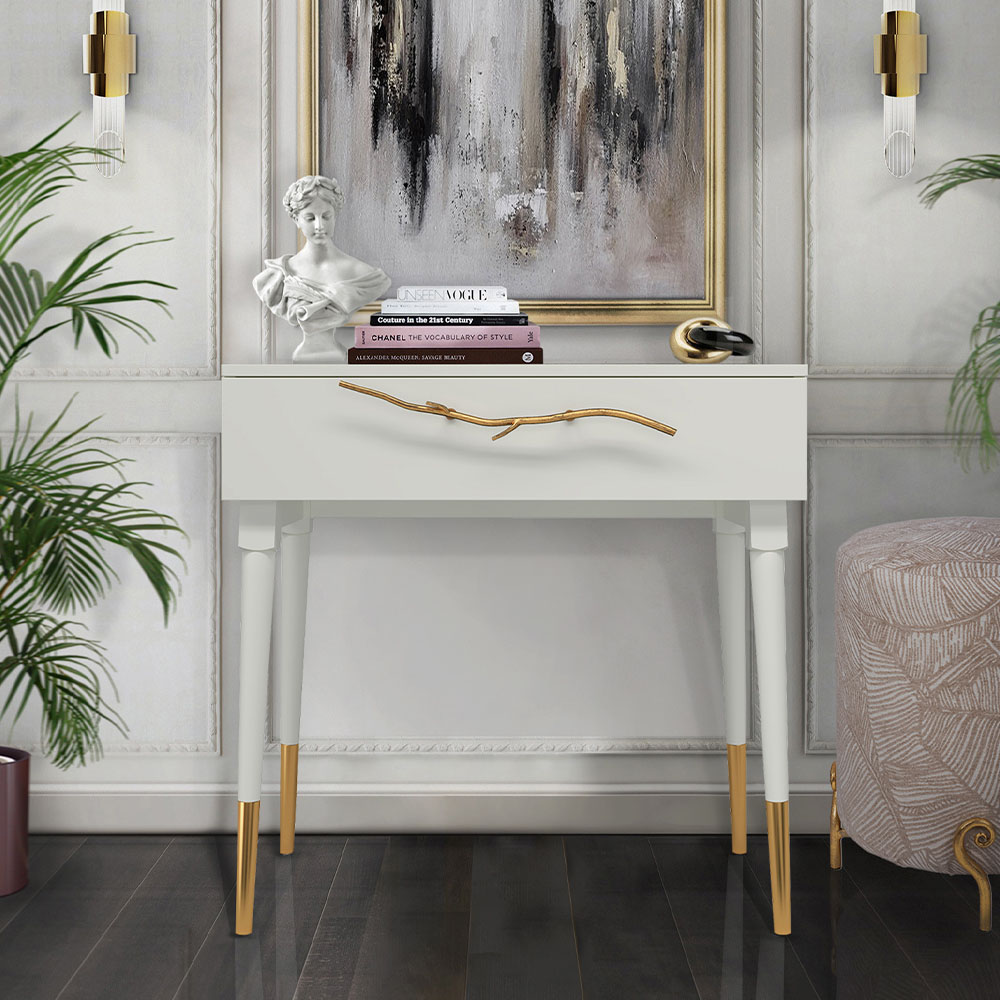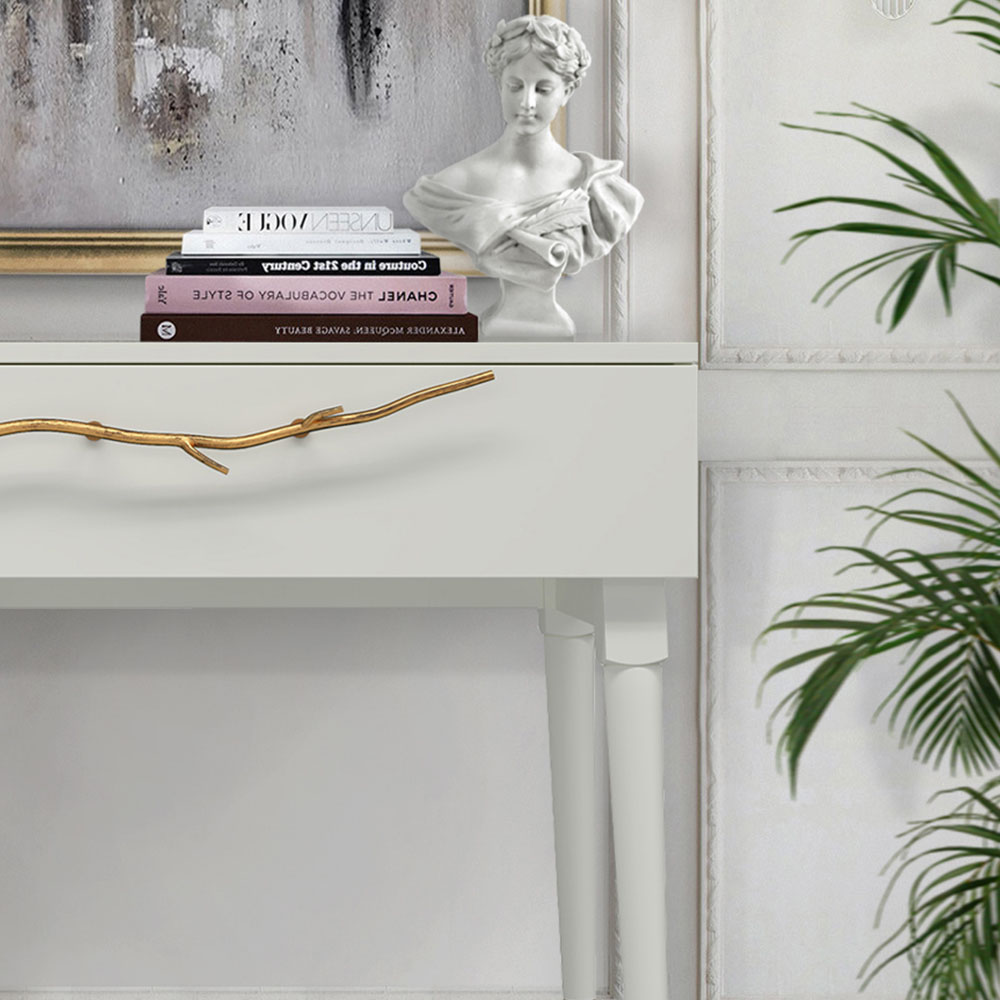 Консольный столик Арт-стайл – от российской фабрики мебели BOGACHO, эффектный предмет интерьера, который позволит создать в вашем доме изысканную обстановку. Консоль можно разместить в любой комнате дома, она гармонично будет смотреться в классическом интерьере, лофт, скандинавский стиль. Эстетика и оригинальный дизайнОбладая оригинальным авторским дизайном, прикроватный столик выделяется оригинальным фасадом. Изюминка изделия – шикарная кованая ручка в форме ветви дерева – ручная работа кузнеца. За изящную ручку удобно открывать и закрывать выдвижной ящик консольного столика.Модель мебели в спальню снабжена качественной фурнитурой, которая обеспечивает плавный ход выдвижного механизма на долгие годы. Материалом изготовления изделия служит Мдф. Декоративные элементы отлиты из коелгинского мрамора, отшлифованы, а затем позолочены вручную. ФункциональностьТуалетный стол с ящиком. А это значит, что вы сможете использовать ее как систему хранения вещей и документов, косметики (стол для макияжа, гримерный) или она подойдет как тумба под телевизор. Вместительный ящик незаменим для того, чтобы наполнить его тем, что должно быть всегда под рукой, в легком доступе. Дополнив его зеркалом, вы устроите себе идеальное место для нанесения ежедневного макияжа и ритуалов красоты. Мебель подойдет как тумба в спальню для девочек, тумба под Тв. КомпактностьКосметический стол может быть установлен в любом удобном для вас месте. Трюмо женское не отнимает пространства, напротив, экономит его, выглядит очень красиво, современно и стильно. Используйте его как мебель в спальню, туалетный столик с зеркалом – за ним удобно сидеть, и он не занимает много места, при этом позволит хранить в ящике все нужные принадлежности. Используйте как мебель для гостиной, на нем удобно расположить ноутбук, светильник или декор.Можно купить тумбу для гостиниц, отелей, загородных домов, коттеджей. Она украсит интерьер и станет незаменимой мебелью для полной комплектации как квартир, так и номеров. Практичность и простота уходаКонсоль в прихожую изготовлена из высококачественного Мдф. Покрытие износостойкое, не требует особого ухода. Достаточно протереть поверхность слегка влажной тряпочкой. Ручка выполнена из кованой стали. Единый стильЛюбите, чтобы интерьер был в едином стиле? Присмотритесь к другой мебели фабрики BOGACHO из коллекции Арт, которая будет гармонично сочетаться друг с другом.