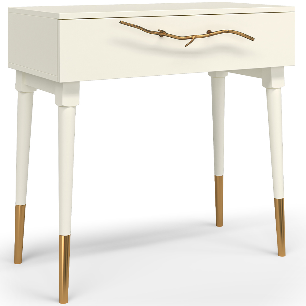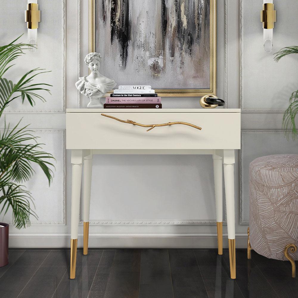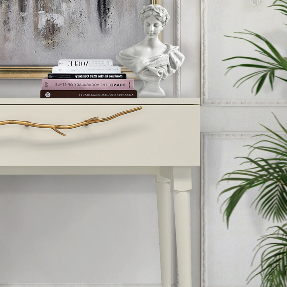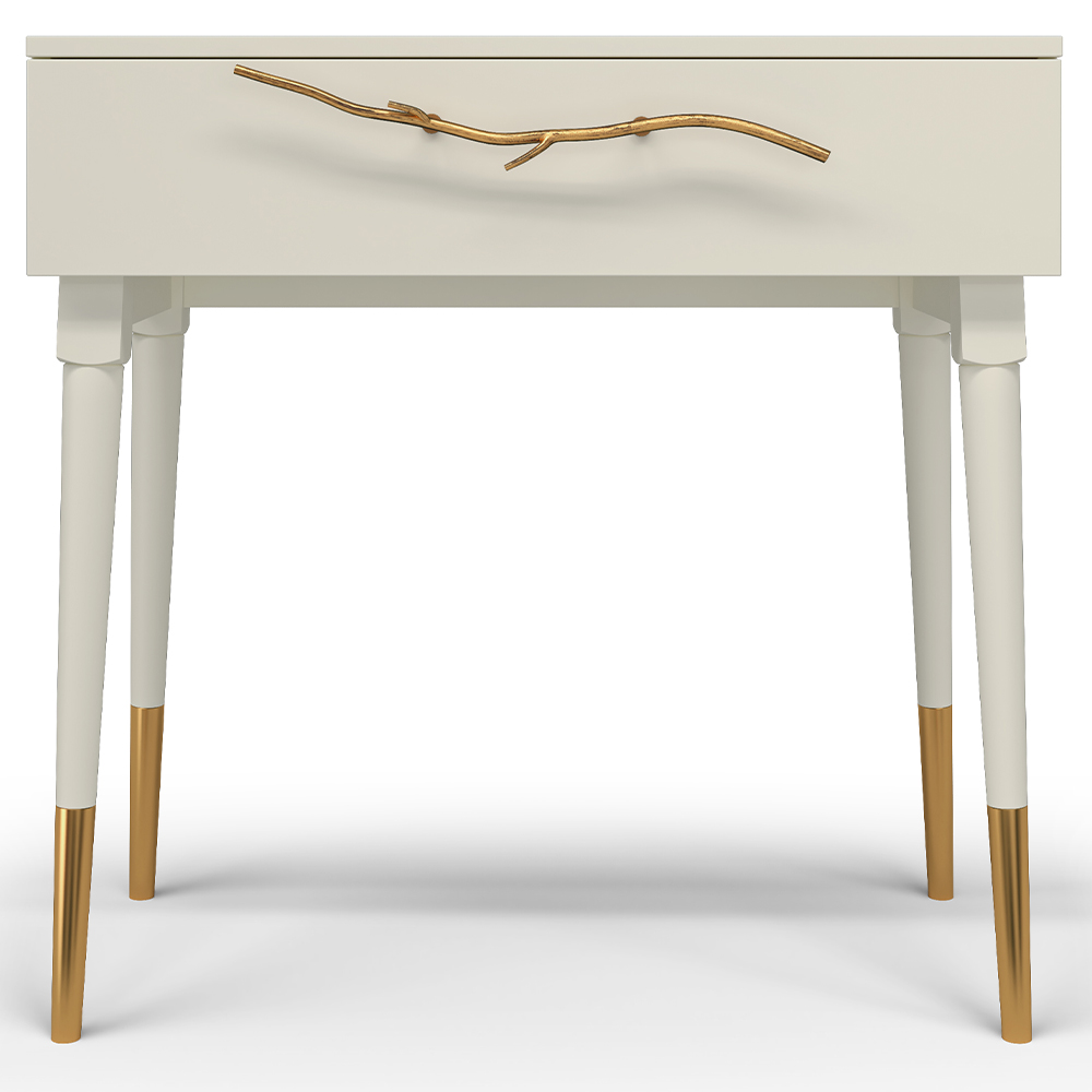Эстетика и ориинальный дизайнОбладая оригинальным авторским дизайном, прикроватный столик выделяется оригинальным фасадом. Изюминка изделия – шикарная кованая ручка в форме ветви дерева – ручная работа кузнеца. За изящную ручку удобно открывать и закрывать выдвижной ящик консольного столика. Фасад украшен тропическими листьями из мраморной пудры в технике мастихиновой живописи.Модель мебели в спальню снабжена качественной фурнитурой, которая обеспечивает плавный ход выдвижного механизма на долгие годы. Материалом изготовления изделия служит Мдф. Декоративные элементы отлиты из коелгинского мрамора, отшлифованы, а затем позолочены вручную.