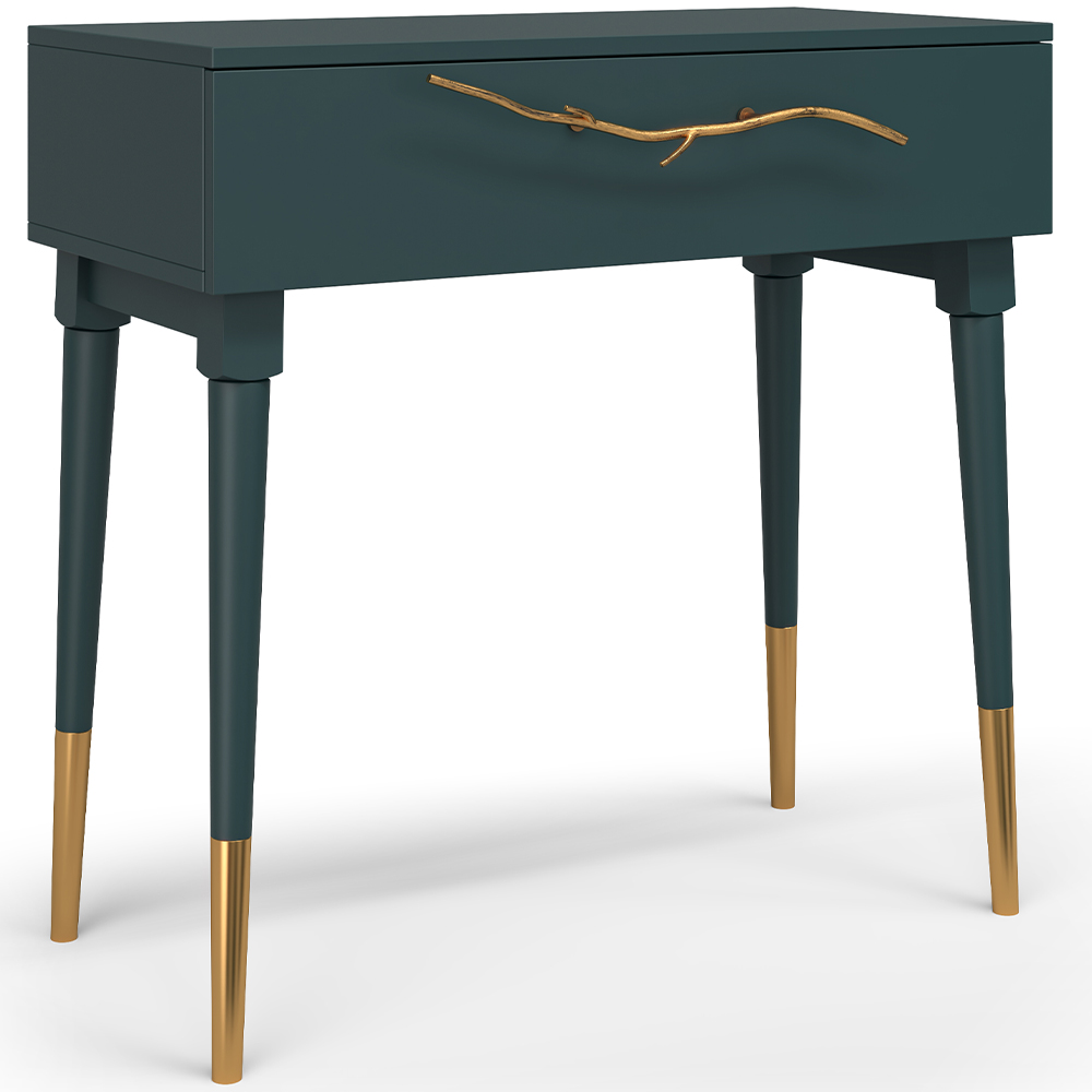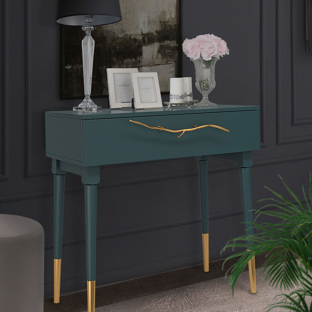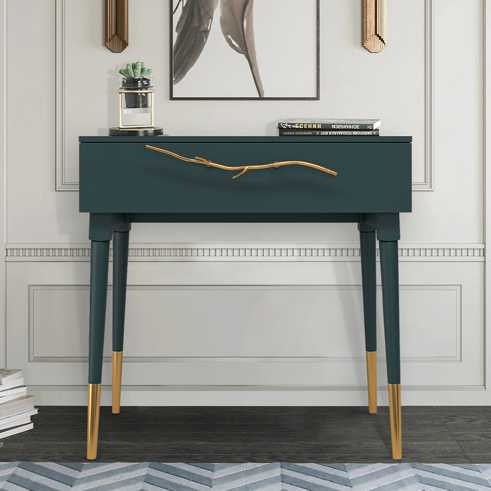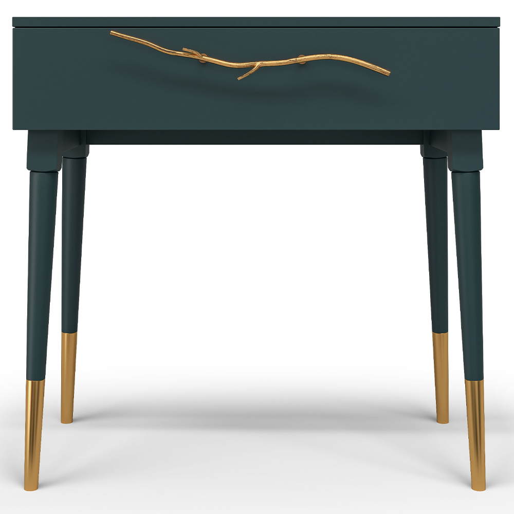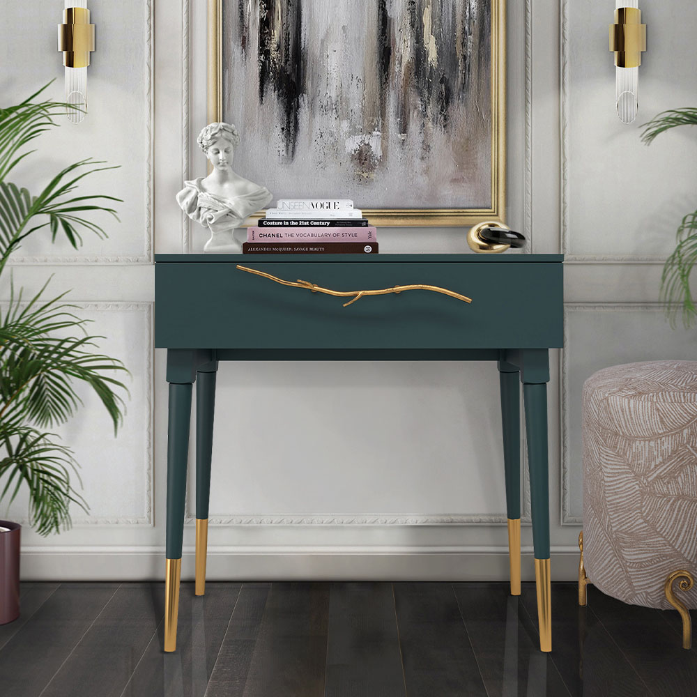 Эстетика и оригинальный дизайнОбладая оригинальным авторским дизайном, прикроватный столик выделяется оригинальным фасадом. Изюминка изделия – шикарная кованая ручка в форме ветви дерева – ручная работа кузнеца. За изящную ручку удобно открывать и закрывать выдвижной ящик консольного столика.Модель мебели в спальню снабжена качественной фурнитурой, которая обеспечивает плавный ход выдвижного механизма на долгие годы. Материалом изготовления изделия служит МДФ. Декоративные элементы отлиты из коелгинского мрамора, отшлифованы, а затем позолочены вручную.