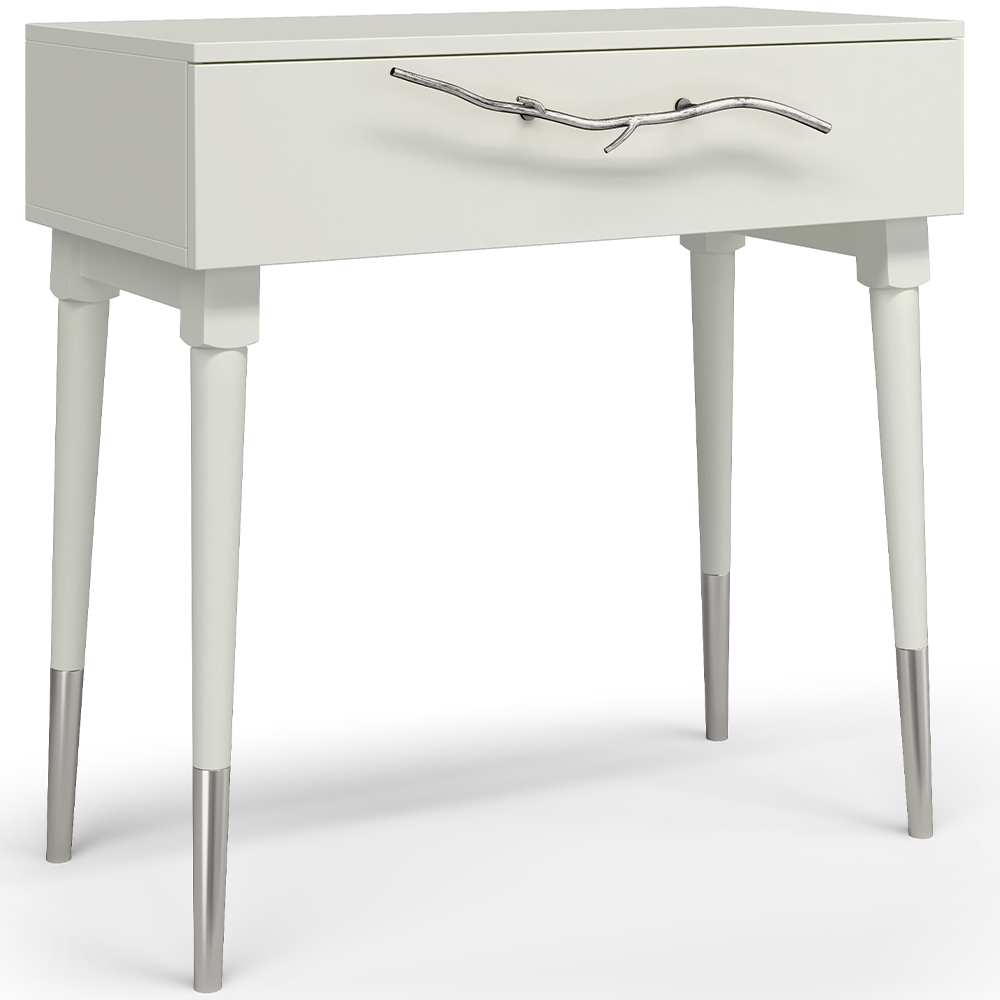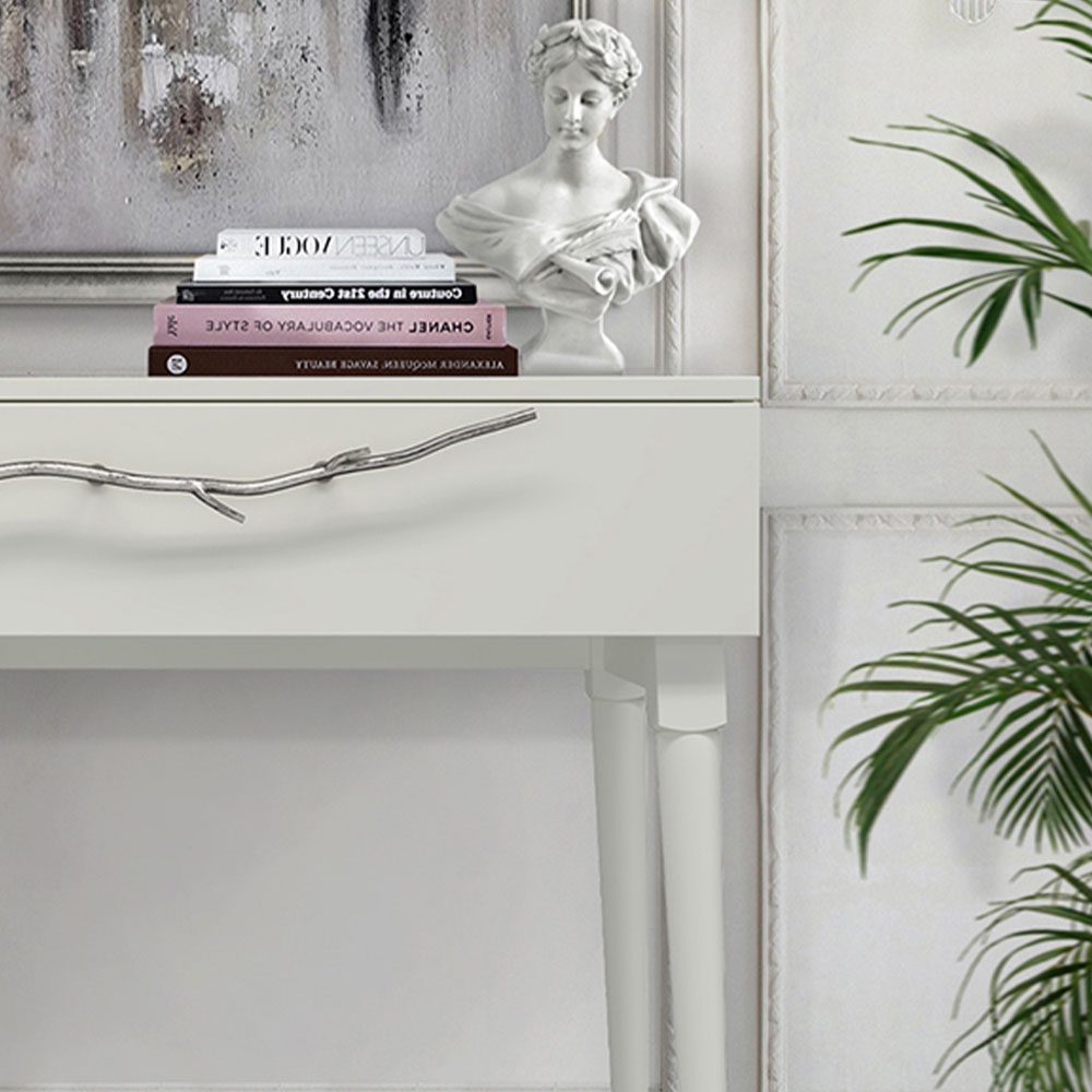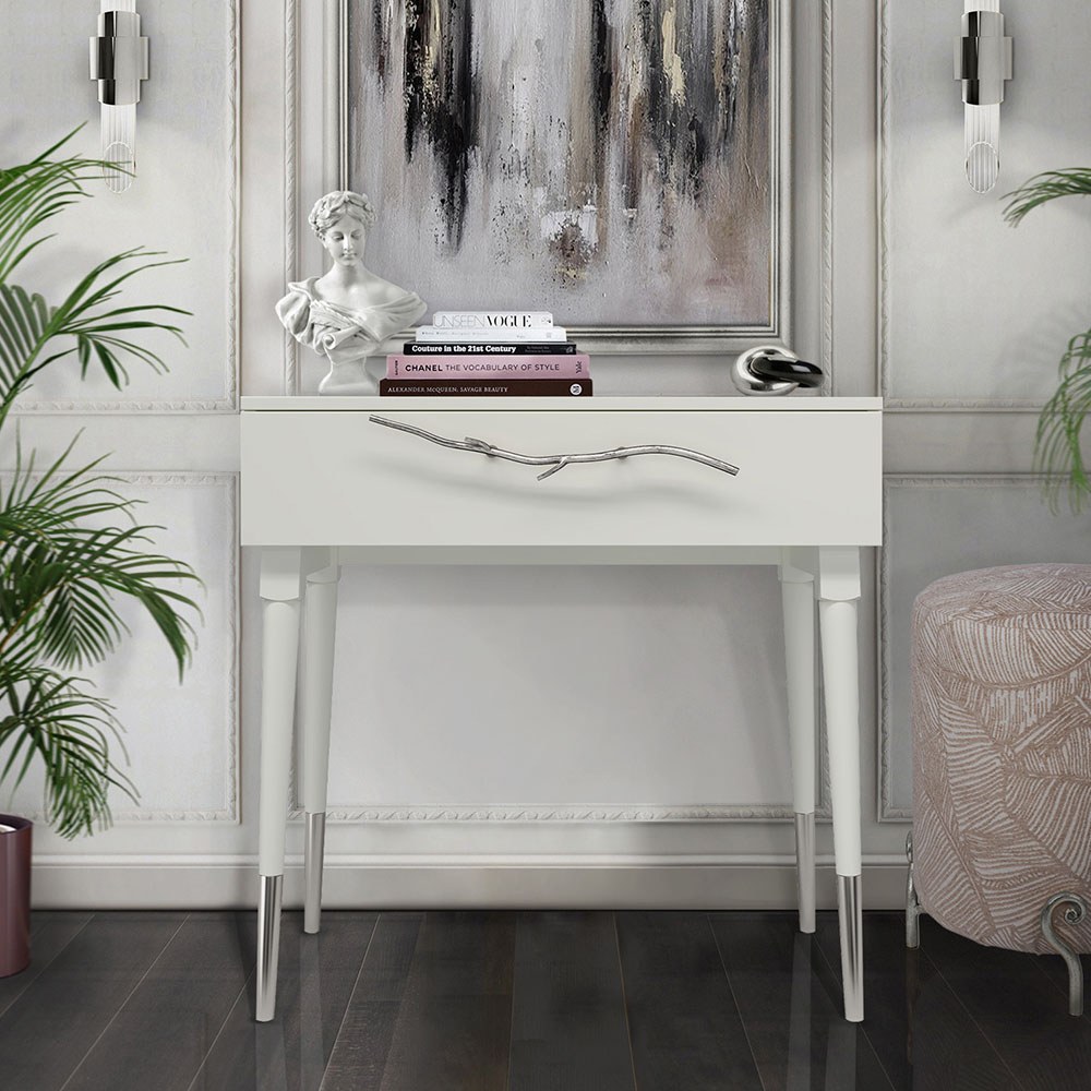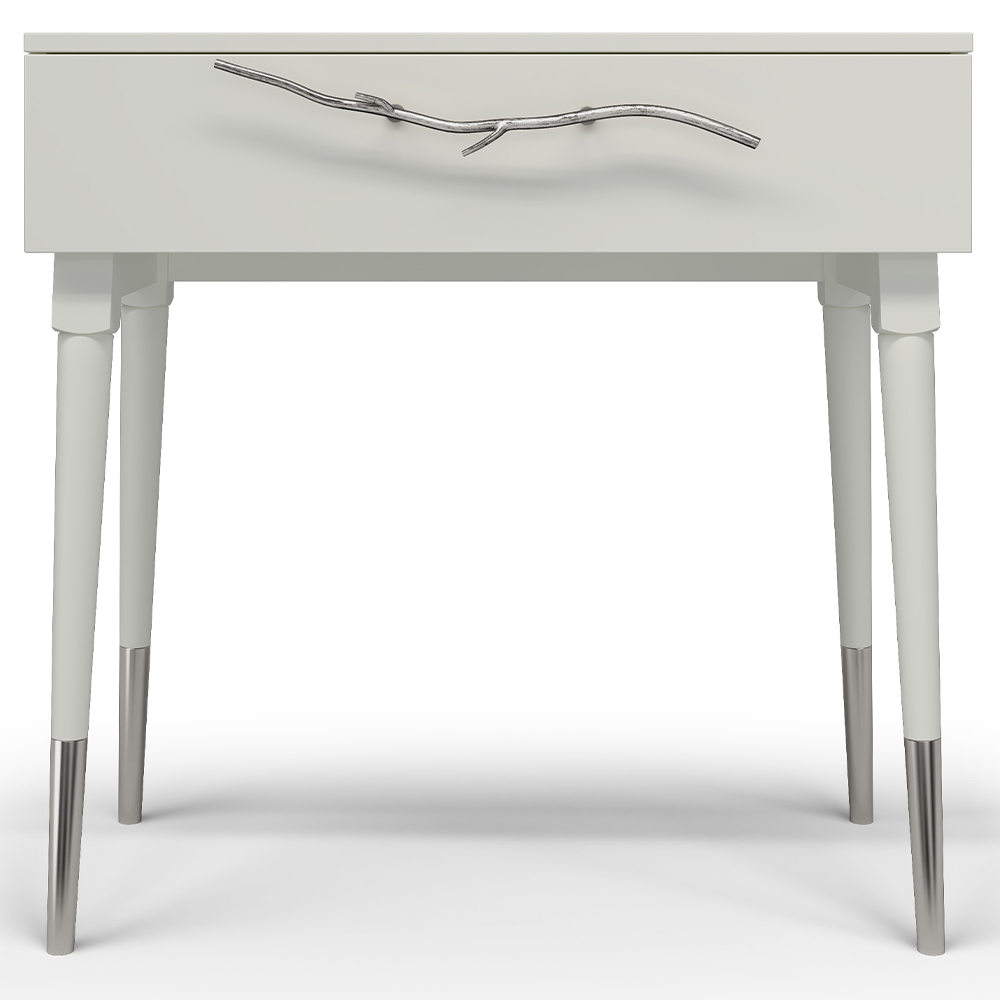 Эстетика и оригинальный дизайнОбладая оригинальным авторским дизайном, прикроватный столик выделяется оригинальным фасадом. Изюминка изделия – шикарная кованая ручка в форме ветви дерева – ручная работа кузнеца. За изящную ручку удобно открывать и закрывать выдвижной ящик консольного столика.Модель мебели в спальню снабжена качественной фурнитурой, которая обеспечивает плавный ход выдвижного механизма на долгие годы. Материалом изготовления изделия служит Мдф. Декоративные элементы отлиты из коелгинского мрамора, отшлифованы, а затем позолочены вручную.