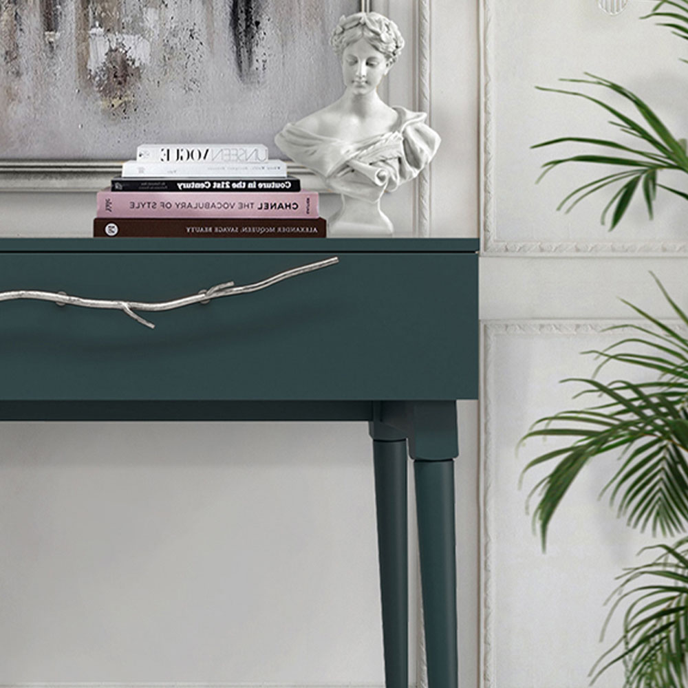 Консольный столик Арт-классик – от российской фабрики мебели BOGACHO, эффектный предмет интерьера, который позволит создать в вашем доме изысканную обстановку. Консоль можно разместить в любой комнате дома, она гармонично будет смотреться в классическом интерьере, лофт, скандинавский стиль Икеа. Эстетика и оригинальный дизайнОбладая оригинальным авторским дизайном, прикроватный столик выделяется оригинальным фасадом. Изюминка изделия – шикарная кованая ручка в форме ветви дерева – ручная работа кузнеца. За изящную ручку удобно открывать и закрывать выдвижной ящик консольного столика. Фасад украшен тропическими листьями из мраморной пудры в технике мастихиновой живописи.Модель мебели в спальню снабжена качественной фурнитурой, которая обеспечивает плавный ход выдвижного механизма на долгие годы. Материалом изготовления изделия служит Мдф. Декоративные элементы отлиты из коелгинского мрамора, отшлифованы, а затем позолочены вручную. ФункциональностьТуалетный стол с ящиком. А это значит, что вы сможете использовать ее как систему хранения вещей и документов, косметики (стол для макияжа, гримерный) или она подойдет как тумба под телевизор. Вместительный ящик незаменим для того, чтобы наполнить его тем, что должно быть всегда под рукой, в легком доступе. Дополнив его зеркалом, вы устроите себе идеальное место для нанесения ежедневного макияжа и ритуалов красоты. Мебель подойдет как тумба в спальню для девочек, тумба под Тв. КомпактностьКосметический стол может быть установлен в любом удобном для вас месте. Трюмо женское не отнимает пространства, напротив, экономит его, выглядит очень красиво, современно и стильно. Используйте его как мебель в спальню, туалетный столик с зеркалом – за ним удобно сидеть, и он не занимает много места, при этом позволит хранить в ящике все нужные принадлежности. Используйте как мебель для гостиной, на нем удобно расположить ноутбук, светильник или декор.Можно купить тумбу для гостиниц, отелей, загородных домов, коттеджей. Она украсит интерьер и станет незаменимой мебелью для полной комплектации как квартир, так и номеров. Практичность и простота уходаКонсоль в прихожую изготовлена из высококачественного Мдф. Покрытие износостойкое, не требует особого ухода. Достаточно протереть поверхность слегка влажной тряпочкой. Ручка выполнена из кованой стали. Единый стильЛюбите, чтобы интерьер был в едином стиле? Присмотритесь к другой мебели фабрики BOGACHO из коллекции Арт, которая будет гармонично сочетаться друг с другом.