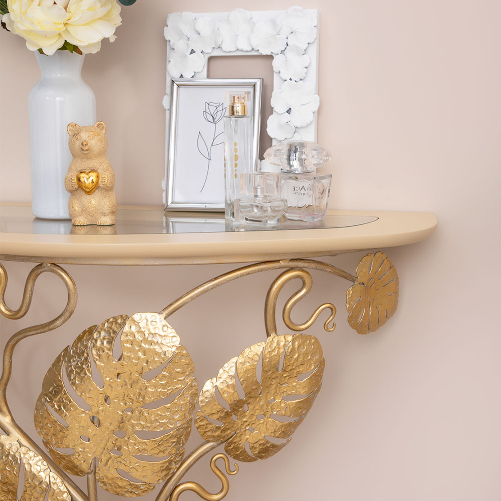 Удивительное сочетание тонкого изящества и трендового стиля в новой модели пристенной консоли Monstera Deliciosa. Консоль представляет собой прочную основу, которую украшают листья монстеры (кованая сталь), поддерживающую столешницу (мдф, стекло). Получается поистине необычная композиция, которой хочется любоваться. В интерьере такой декор выгодно дополнит современный стиль.В плане применения столик консоль – довольно универсальная мебель. В комплекте с зеркалом, может использоваться как туалетный стол; поместите его в прихожую – и у вас получится пристенный столик для декора, книг, косметики или даже поставка на ножках для цветов. Изысканный дизайн, функциональное применение!
