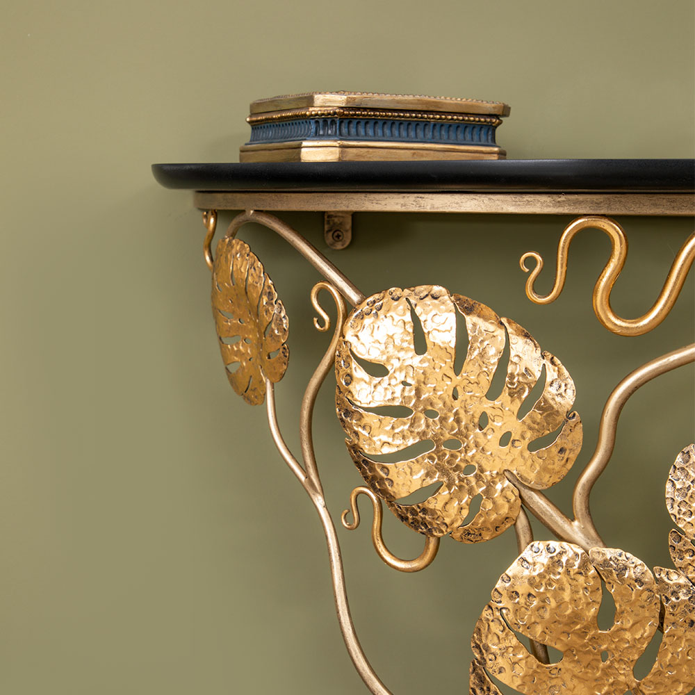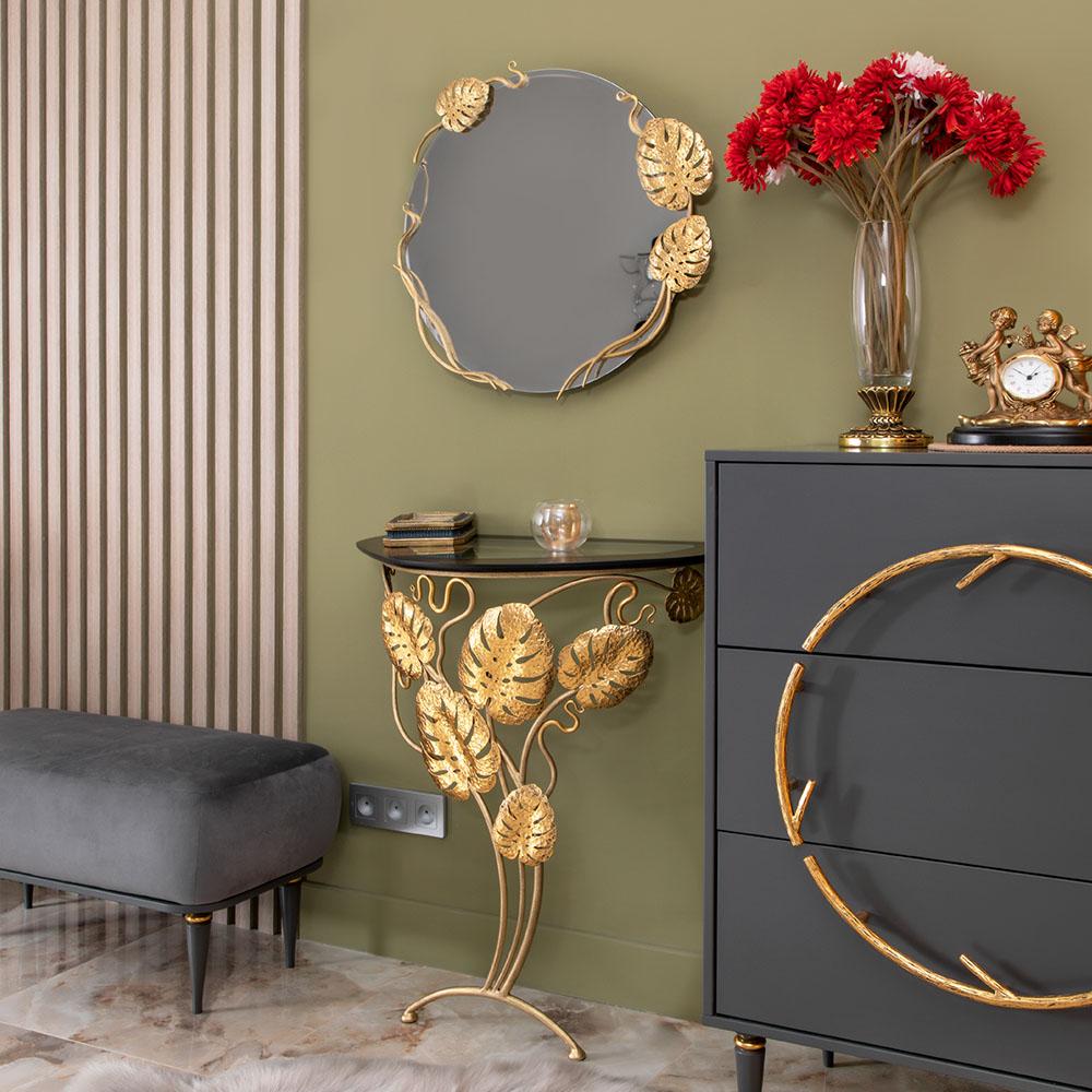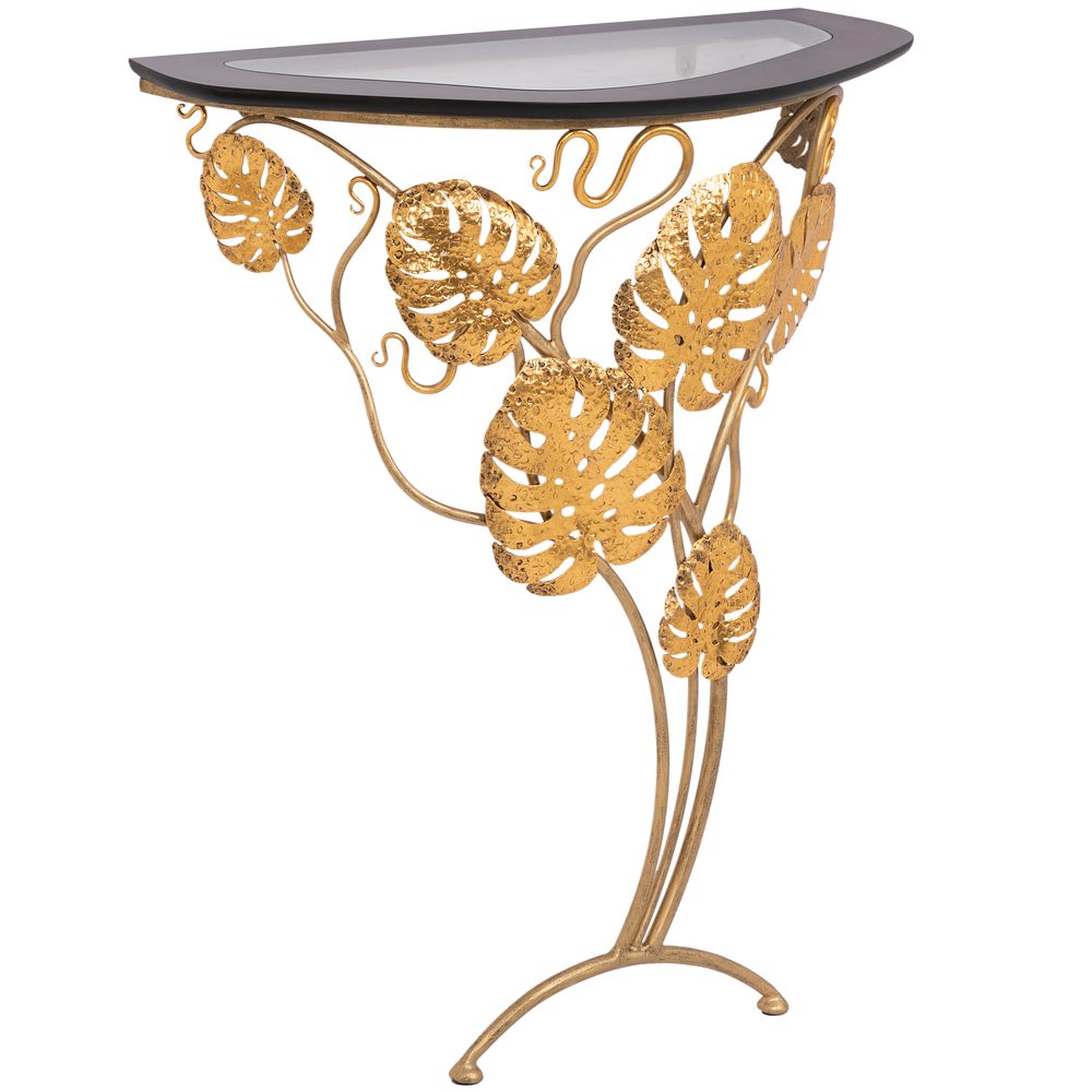 Удивительное сочетание тонкого изящества и трендового стиля в новой модели пристенной консоли Monstera Deliciosa. Консоль представляет собой прочную основу, которую украшают листья монстеры (кованая сталь), поддерживающую столешницу (мдф, стекло). Получается поистине необычная композиция, которой хочется любоваться. В интерьере такой декор выгодно дополнит современный стиль.В плане применения столик консоль – довольно универсальная мебель. В комплекте с зеркалом, может использоваться как туалетный стол; поместите его в прихожую – и у вас получится пристенный столик для декора, книг, косметики или даже поставка на ножках для цветов. Изысканный дизайн, функциональное применение!