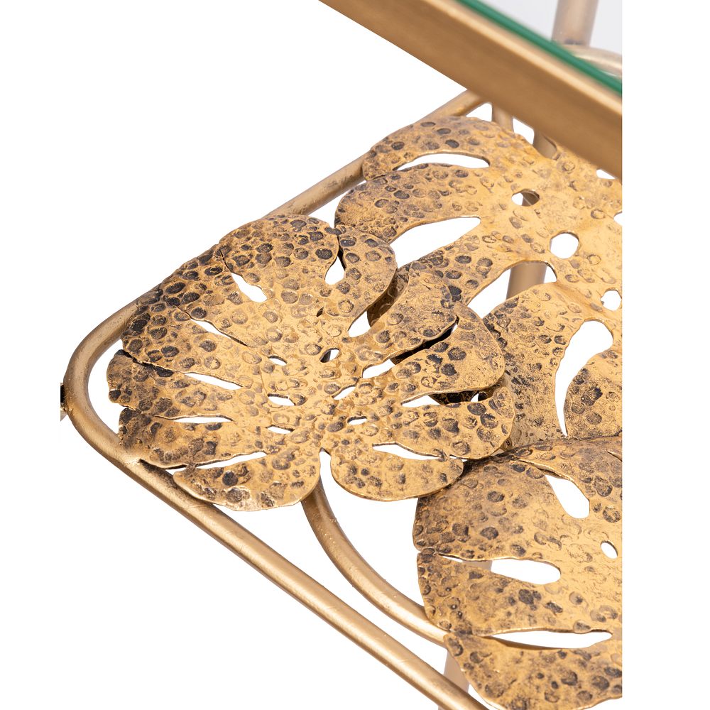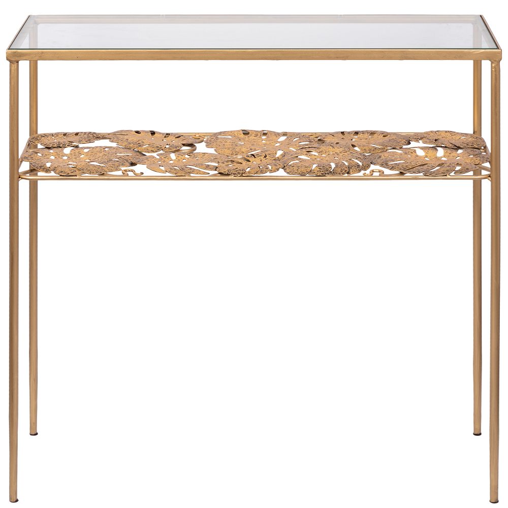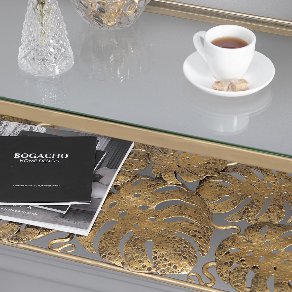 Удивительное сочетание тонкого изящества и трендового стиля в новой модели пристенной консоли "Monstera Deliciosa". Консоль представляет собой прочную основу, которую украшают листья монстеры (кованая сталь), поддерживающую невесомую столешницу (стекло). Получается поистине необычная композиция, которой хочется любоваться. Этот стол-консоль представлен в трех цветах: бронза / золото / серебро.В интерьере такой декор выгодно дополнит современный стиль.