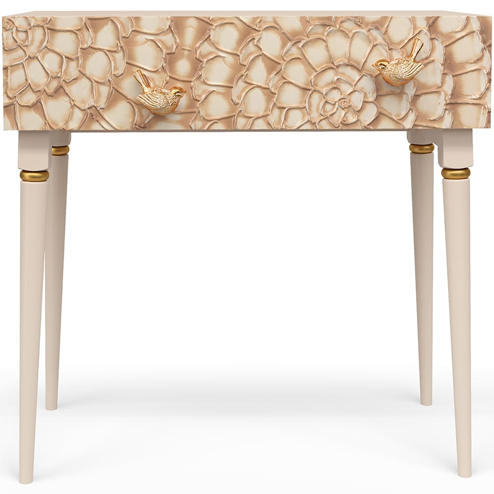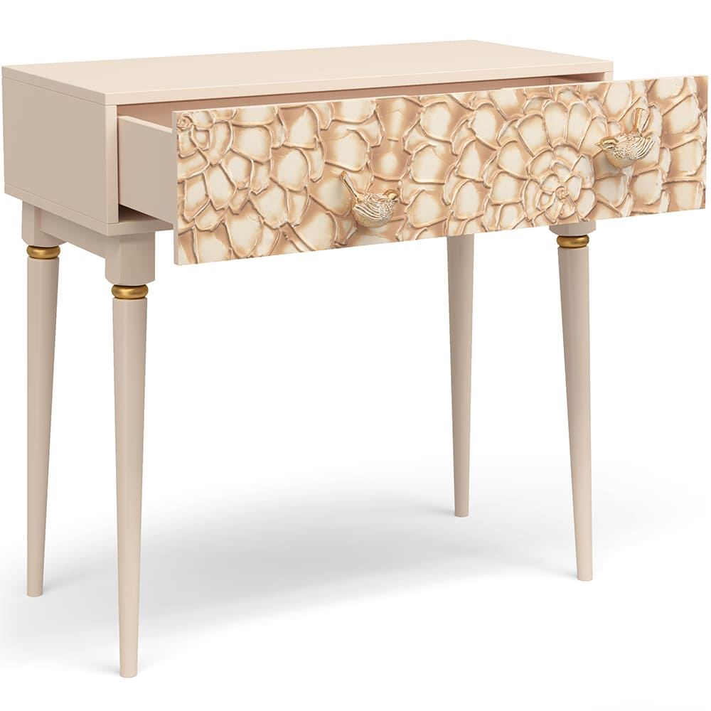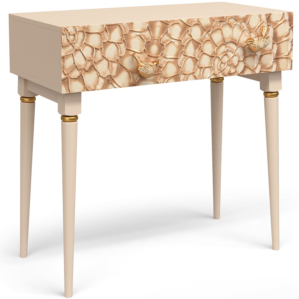 Консоль из мдф с высокими ножками. Консоль совершенно нового формата из коллекции Терра позволяет преобразить дизайн и заполнить пространство природным шармом. Пристенный стол Терра - это гармония в каждой детали. Конические ножки прочно держат классическую форму изделия и добавляют изысканности интерьеру вашего дома. Консоль изготавливается из мдф. Декоративные элементы выполняются в технике мастихиновой живописи из натурального коелгинского мрамора мелкой фракции. Птички изготовлены из литьевого мрамора. Изделие приходит в собранном виде за исключением ножек.