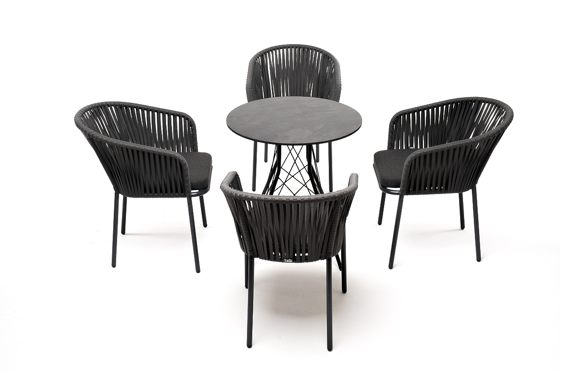 4 кресла из коллекции «Бордо», выполненных из алюминиевого каркаса и ручной оплетки роупом. Это эластичные синтетические ленты из высокопрочных полиэфирных волокон, представлены в темно-сером цвете.