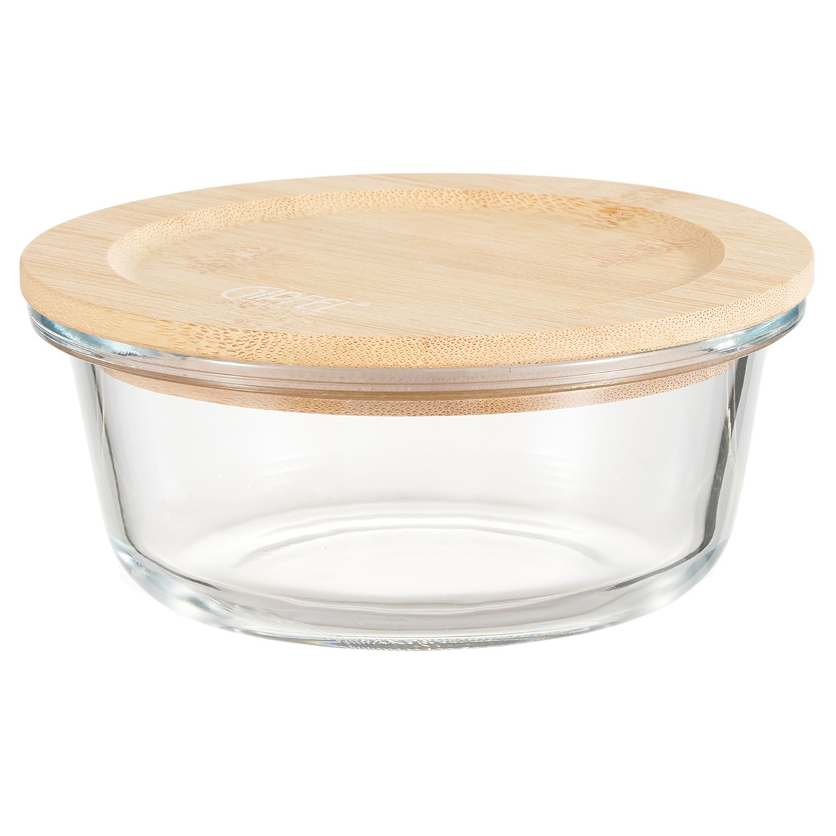 Контейнер стеклянный Gipfel Stor 51957 круглой формы диаметром 13 см, высотой 5,5 см. Объем 370 мл. В комплекте крышка из бамбука.