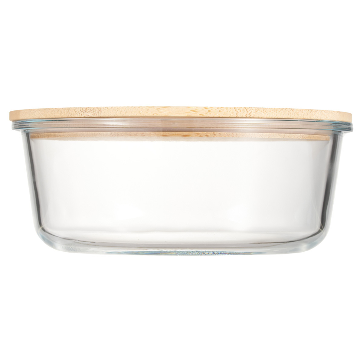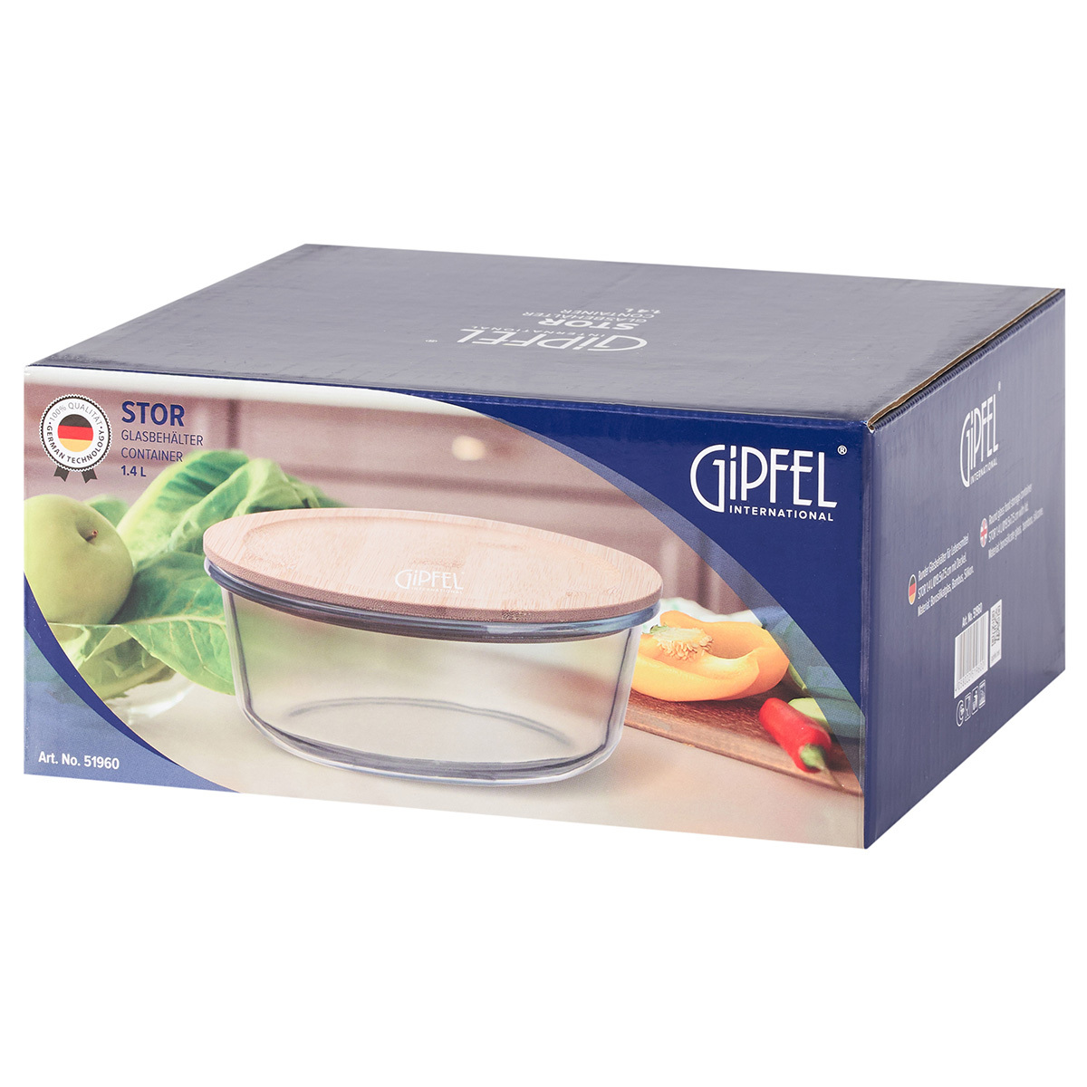 Контейнер стеклянный Gipfel Stor 51960 круглой формы диаметром 19 см, высотой 7,5 см. Объем 1400 мл. В комплекте крышка из бамбука. Изготовлен из жаропрочного боросиликатного стекла.