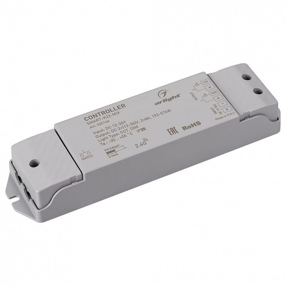 Контроллер для светодиодной MIX ленты (ШИМ)., Питание/рабочее напряжение 12-36VDC, максимальный ток 8A на канал, 2 канала, максимальная мощность 192-576W., Винтовые клеммы., Корпус - PVC., Габариты 175x45x27 мм., Управляется пультами и панелями серии SMART (поставляются отдельно).
