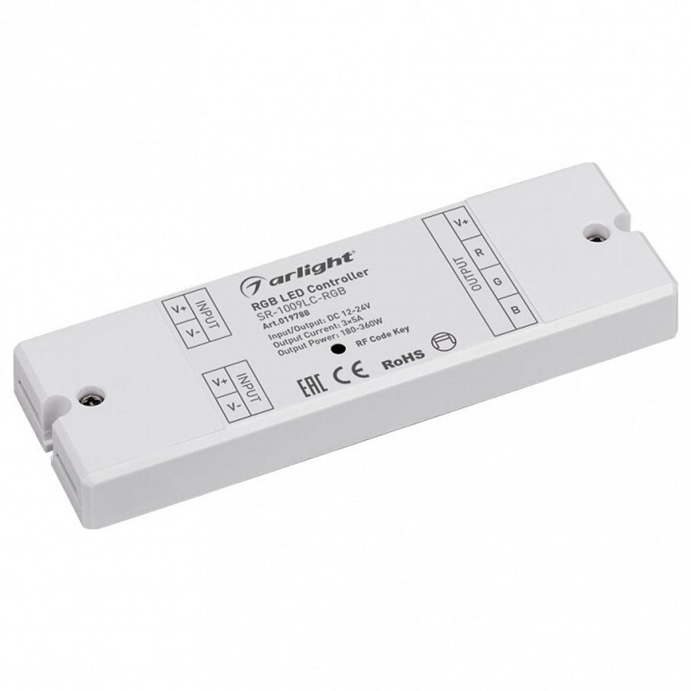 Контроллер для светодиодной RGB ленты (ШИМ)., Питание/рабочее напряжение 12-24VDC, максимальный ток 5A на канал, 3 канала, максимальная мощность 180-360W., Винтовые клеммы., Корпус - PVC., Габариты 145х46х16 мм., Управляется пультами и панелями серии SR-1009x (поставляются отдельно)., Список совместимых пультов и панелей смотрите в сопутствующих товарах и в инструкции.