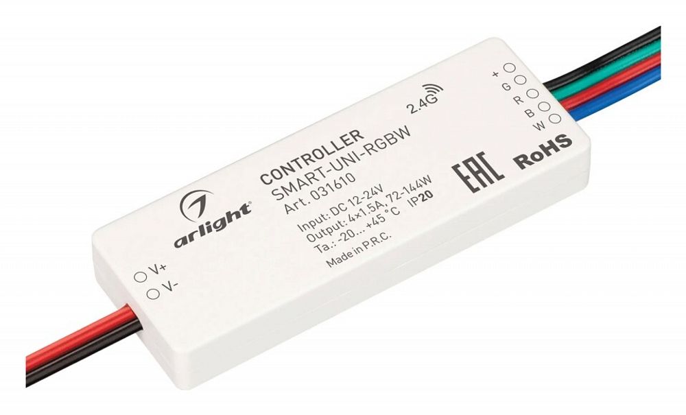 Контроллер для мультицветной (RGBW) светодиодной ленты (ШИМ). Питание/рабочее напряжение 12-24VDC, максимальный ток 1.5A на канал, 4 канала, максимальная мощность 72-144W. Корпус - PVC. Габариты 64x23.5x8.5 мм. Управляется пультами и панелями серии SMART (поставляются отдельно). !!!Актуальная схема привязки пультов в инструкции на сайте!!!