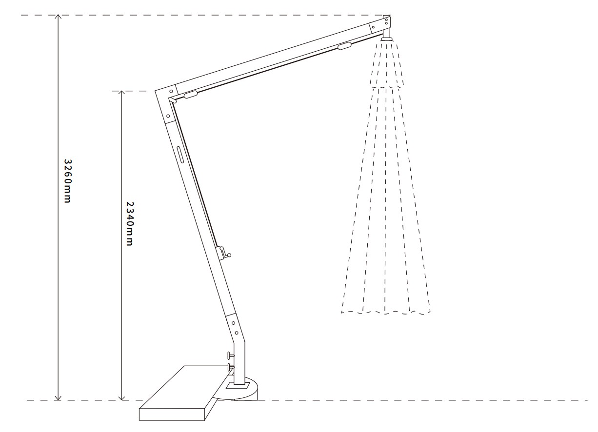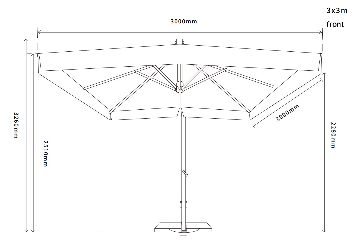 Общая высота зонта - 326 см, высота от земли до нижнего края купола - 228 см.