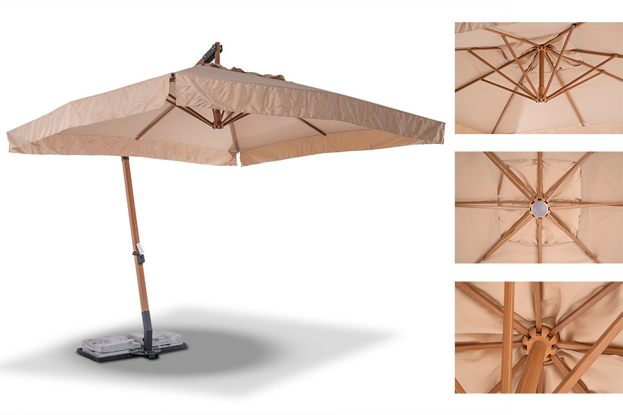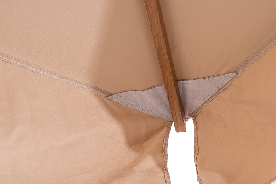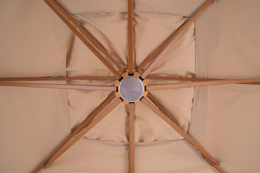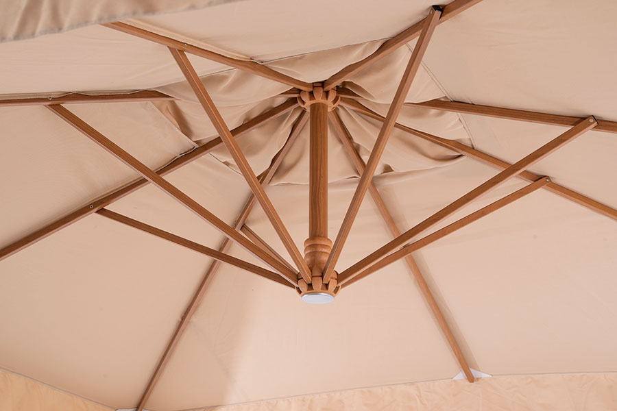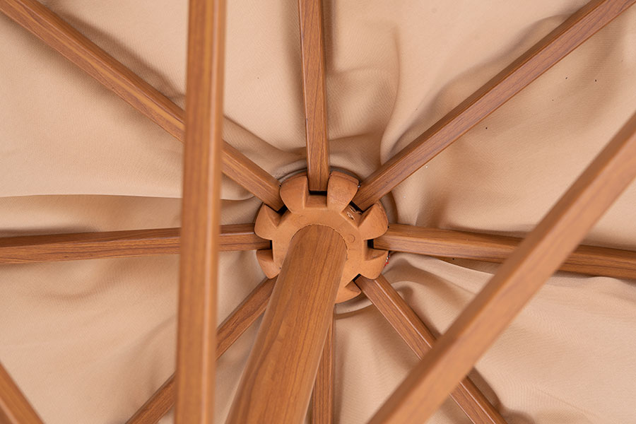 Зонт состоит из восьми алюминиевых спиц и алюминиевой боковой опоры из двух частей, соединенных стальной основой.