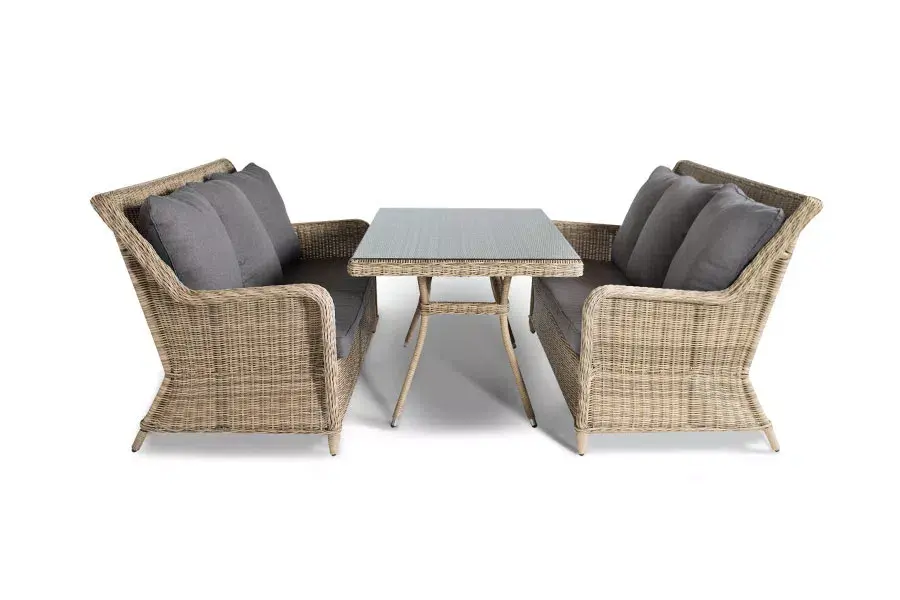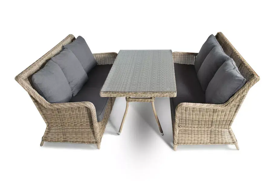 Для создания каркаса мебели используется алюминий. Каркас плотно оплетается вручную круглым искусственным ротангом. Цвет набора – натуральный соломенный.