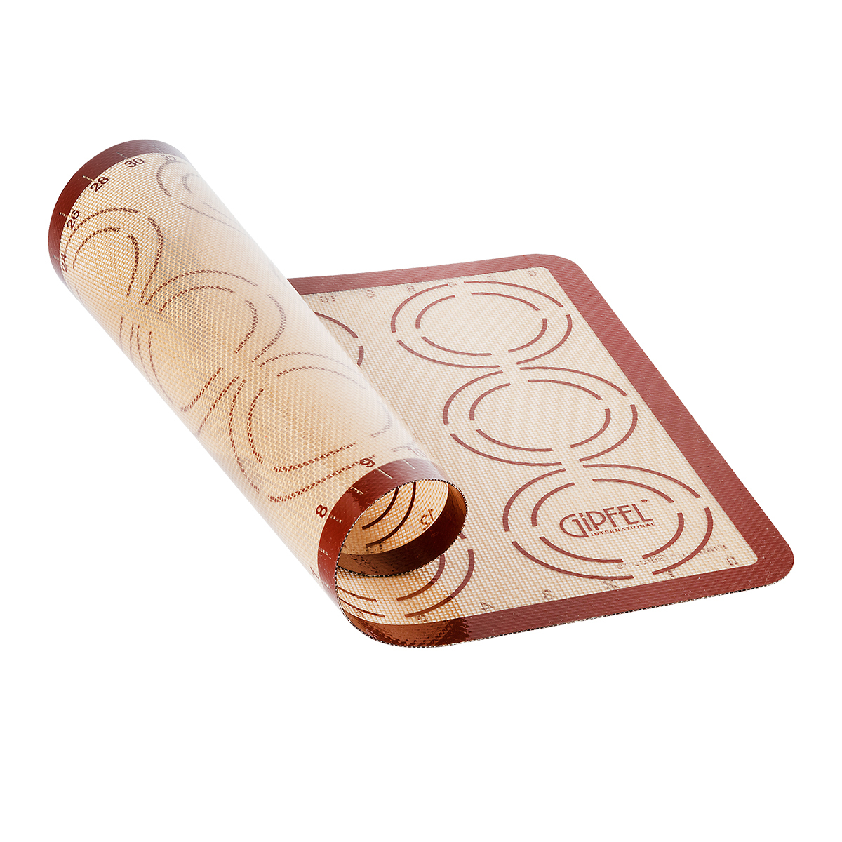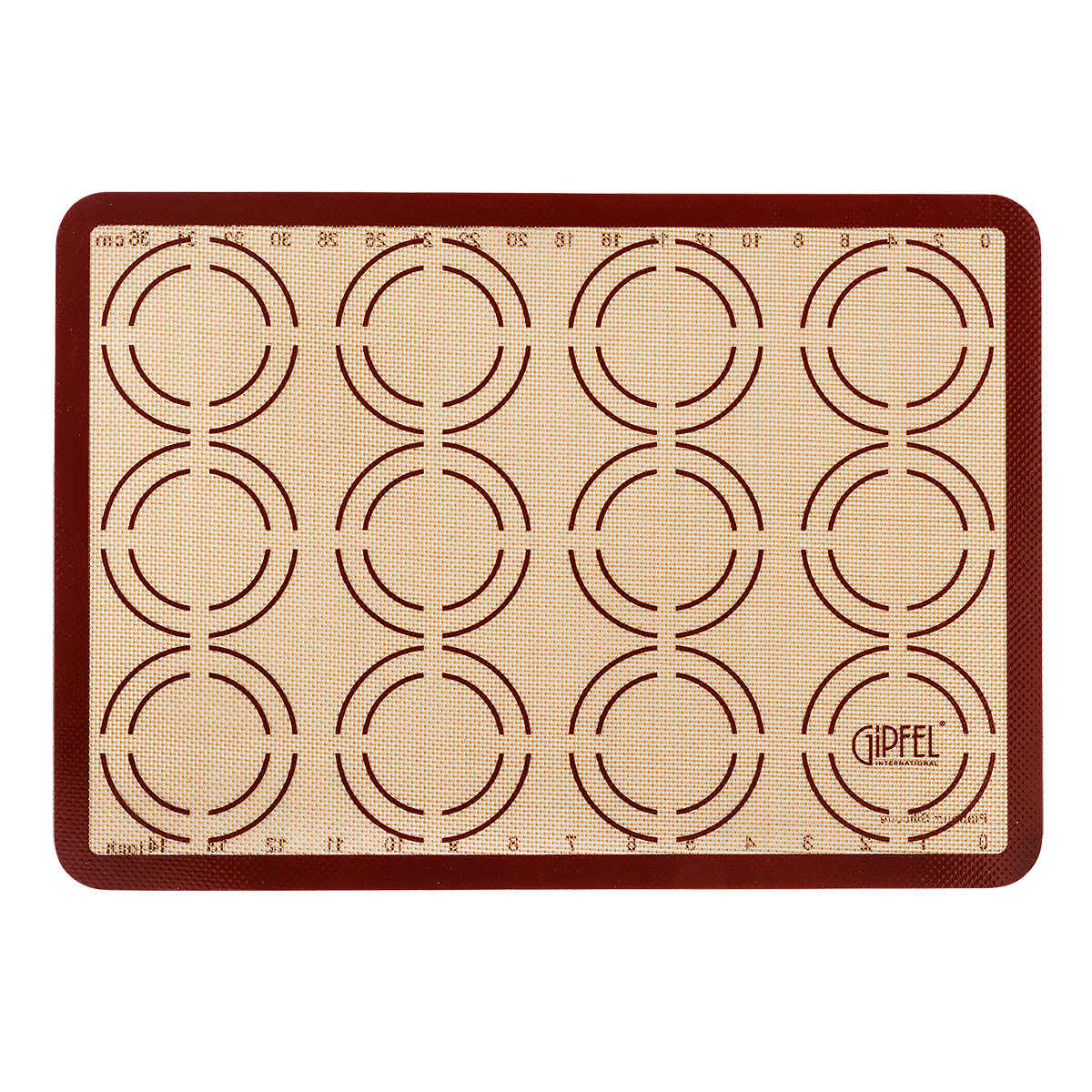 Коврик для выпечки GIPFEL ECO 51192. Размер 42x29,5 см. Изготовлен из силикона и стекловолокна. Поверхность армированная, что повышает прочность. На коврике удобная линейка в сантиметрах и дюймах, а также разметка для ровной раскладки печенья или безе одинакового размера. Размер упаковки 4х4х40 см. Вес 220 гр.