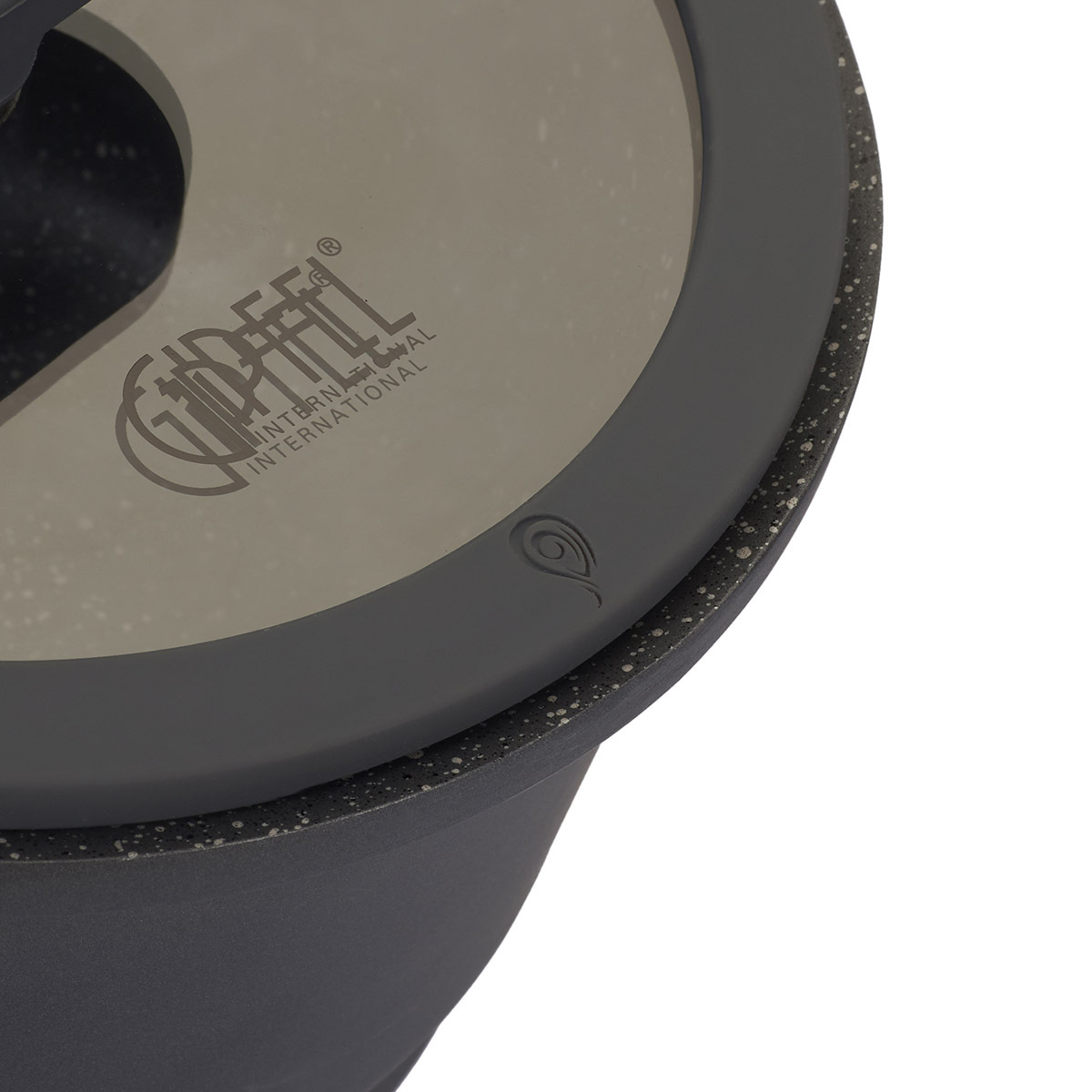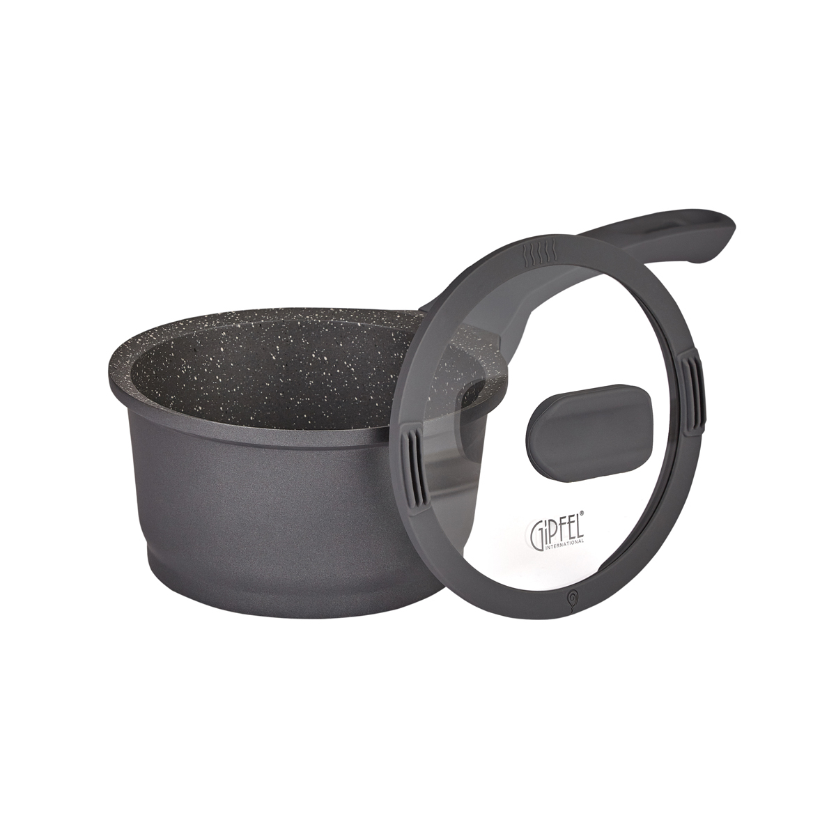 Ковш GIPFEL Veding 0592. Размер 16х9,5см, объем 1,5л. В комплекте со стеклянной крышкой. Сделан из литого алюминия. Имеет индукционное дно. У ковша мраморное антипригарное покрытие Ilag Ultimate. Ручки крышки и ковша сделаны из бакелита с покрытием Soft Touch. На ручке крышки выемка, в которую можно положить ложку или половник.