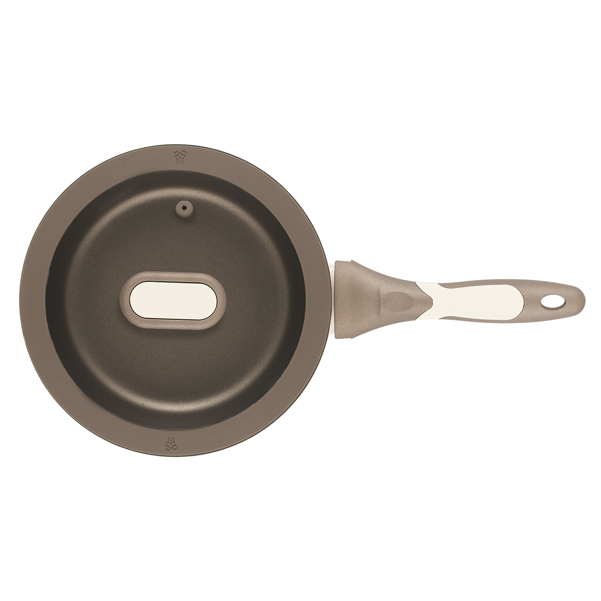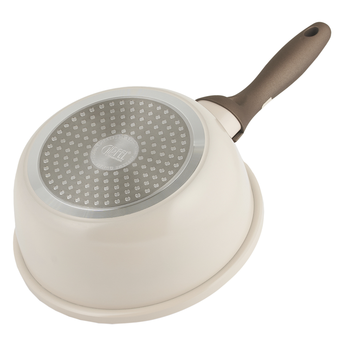 Ковш Gipfel STADELLA BEIGE 51106. Размер 18х8,5 см, объем 2 л. В комплекте стеклянная крышка. Ковш сделан из прессованного алюминия. У ковша бакелитовая ручка с покрытием Soft-touch. Оснащен двуслойным антипригарным покрытием Pfluon COOKMARK. Подходит для любых видов плит, включая индукционные. Толщина стенок 2,5 мм, толщина дна 5,5 мм.