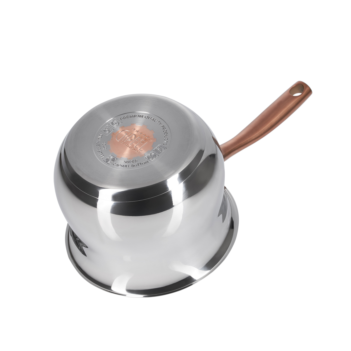 Вся серия посуды ABSOLUTE изготовлена из высококачественной медицинской стали марки 18/10. Она обладает повышенными антидеформационными свойствами и не боится высоких температур, в ней можно смело хранить пищу после приготовления. Также стоит отметить капсульное дно в посуде ABSOLUTE – между нержавейкой расположен слой алюминия, который обеспечивает быстрый и равномерный нагрев посуды при готовке. Толщина корпуса составляет 0,8 мм, а объем ковша – 2,4 литра. В комплект входит стальная крышка.