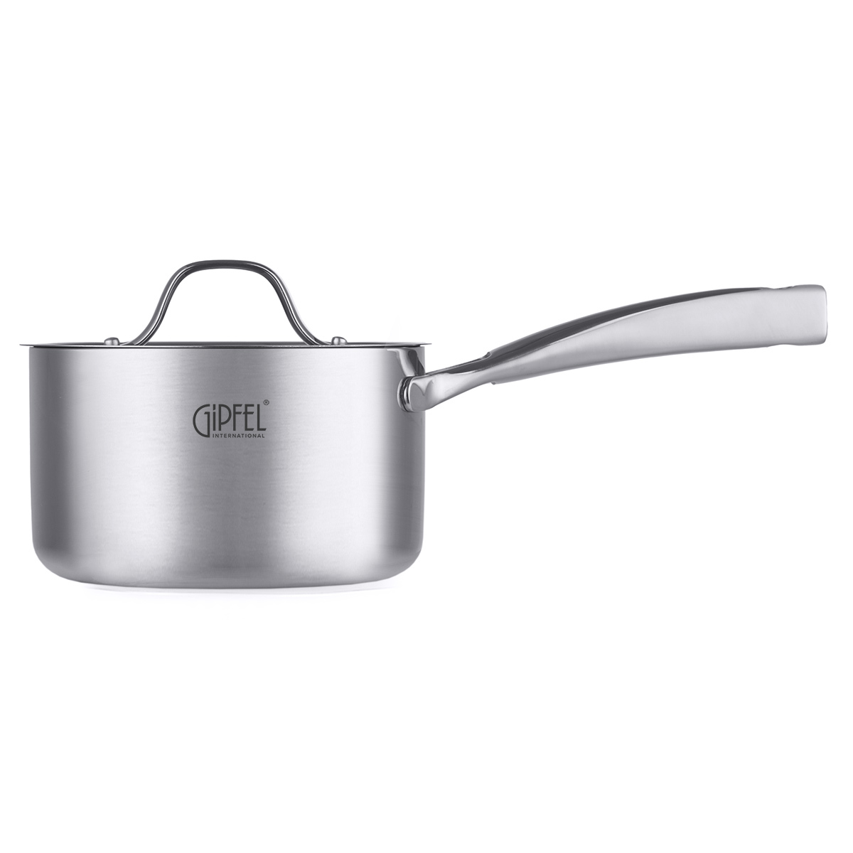 Ковш из нержавеющей стали Gipfel Galaxy 51966. Объем данной модели 1,9 л, диаметр 16 см, высота стенок 9,5 см. Толщина – 2,3 мм (нержавеющая сталь 18/10 (0,5 мм) + алюминий (1,3 мм) + нержавеющая сталь 18/0 (0,5 мм)). Толщина крышки – 0,7мм. Между слоями нержавеющей стали, которая с одной стороны соприкасается с поверхностью плиты, а с другой стороны контактирует с едой, заключен слой алюминия. Алюминий запаян внутрь стальной оболочки.