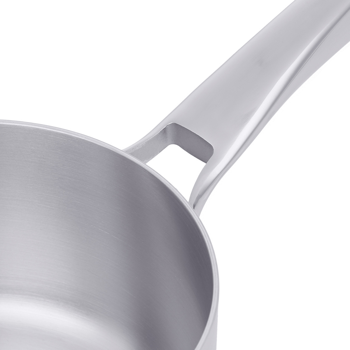 У ковша индукционное капсульное дно: при приготовлении пища нагревается равномерно и не подгорает, стенки не ломаются и не деформируются при использовании на различных видах плит.