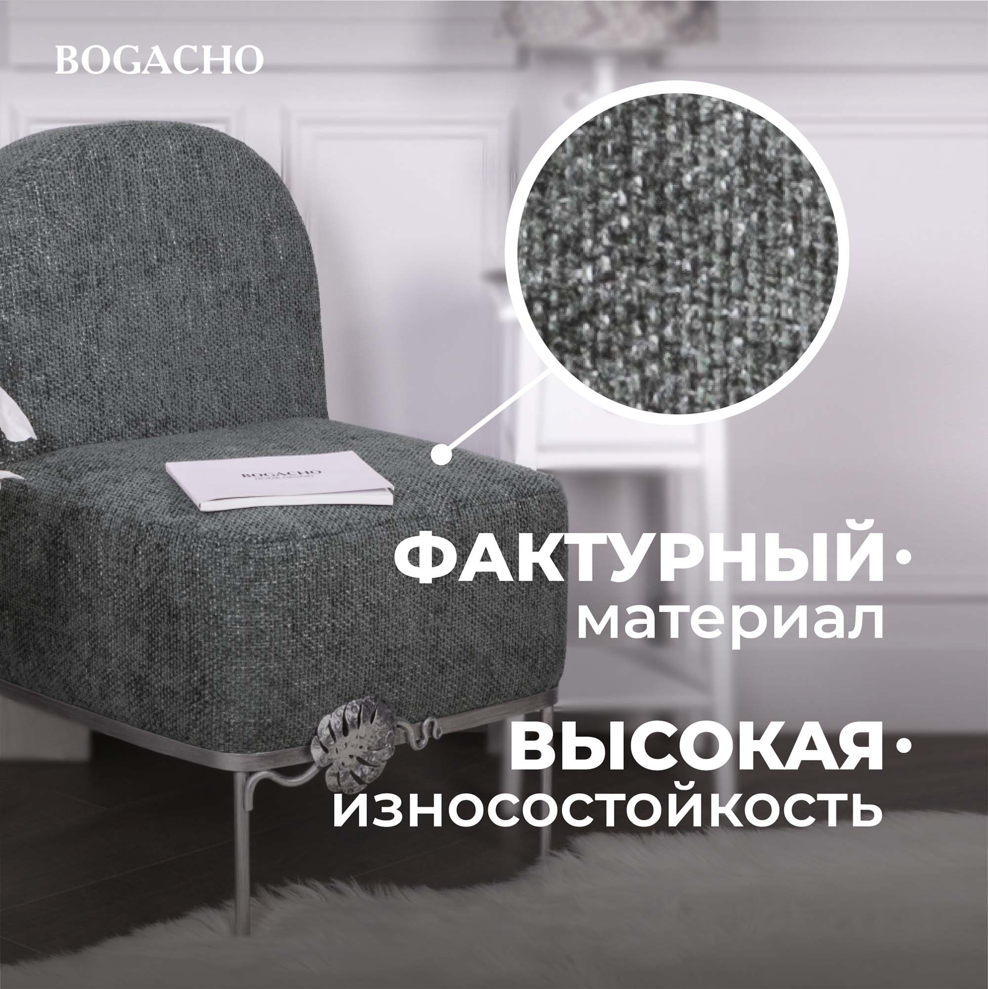 Кресло – от российской фабрики мебели BOGACHO, эффектный предмет интерьера, который позволит создать в вашем доме изысканную обстановку. Кресло для отдыха– важный элемент мебели, без которого не обходится ни один дом или квартира. Кресло можно разместить в любой комнате дома, они гармонично будут смотреться в классическом интерьере, лофт, скандинавский стиль. Мы тщательно работали над внешним видом кресла, чтобы передать эстетику роскошных, уютных и практичных английских домов.Кресло с кованым листом Монстеры – великолепное произведение искусства, соединение кропотливого труда искусных мастеров и уточнённой фантазии дизайнера. Уютное интерьерное кресло на ножках прекрасно впишется в любой современный домашний или офисный интерьер. Мебель от фабрики BOGACHO разнообразит дизайн дома в гостиной, спальне, детской комнате, может стать отличным элементом декора в рабочем кабинете руководителя в офисе, в кафе или баре, в гостинице. Мебель для квартиры нашего бренда можно поставить в прихожую, в спальню или лоджию. Наша мебель создана для дома, для квартиры, для дачи, для гостиницы, в отель, салон красоты, ресторан. Кресло без подлокотников, выполнено в стиле своременной классики. Изделие отличается прочной устойчивой конструкцией и прослужит не один год! Каркас – основание изготовлен из кованой стали.Поверхность патинированамастерами фабрии вручную. В качестве наполнителя используется – ППУ (пенополиуретан), материал для обивки: износоустойчивый шенилл. Любите, чтобы интерьер был в едином стиле? Присмотритесь к другой мебели фабрики BOGACHO, которая будет гармонично сочетаться друг с другом. В нашем каталоге есть готовые интерьерные решения с диванами и креслами.