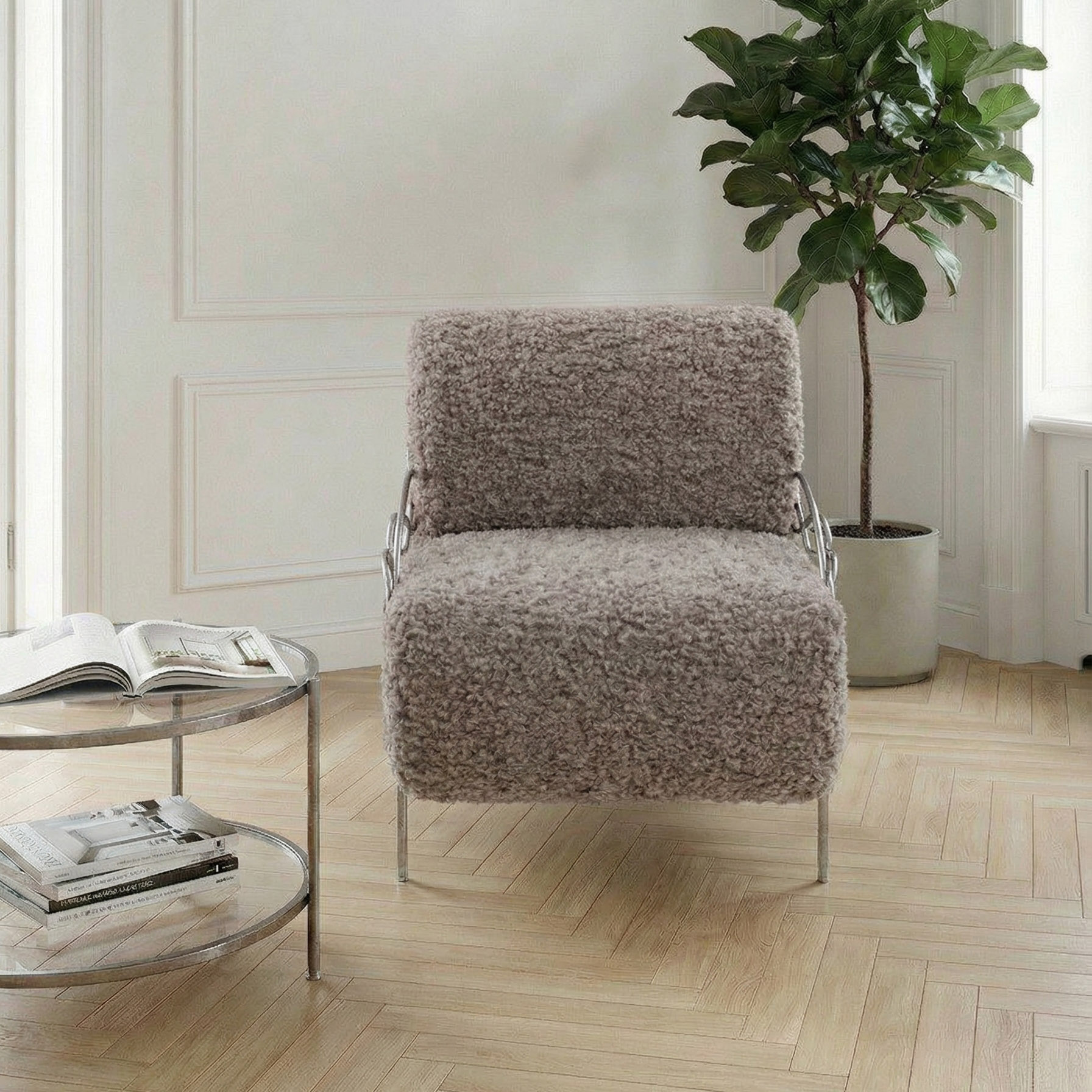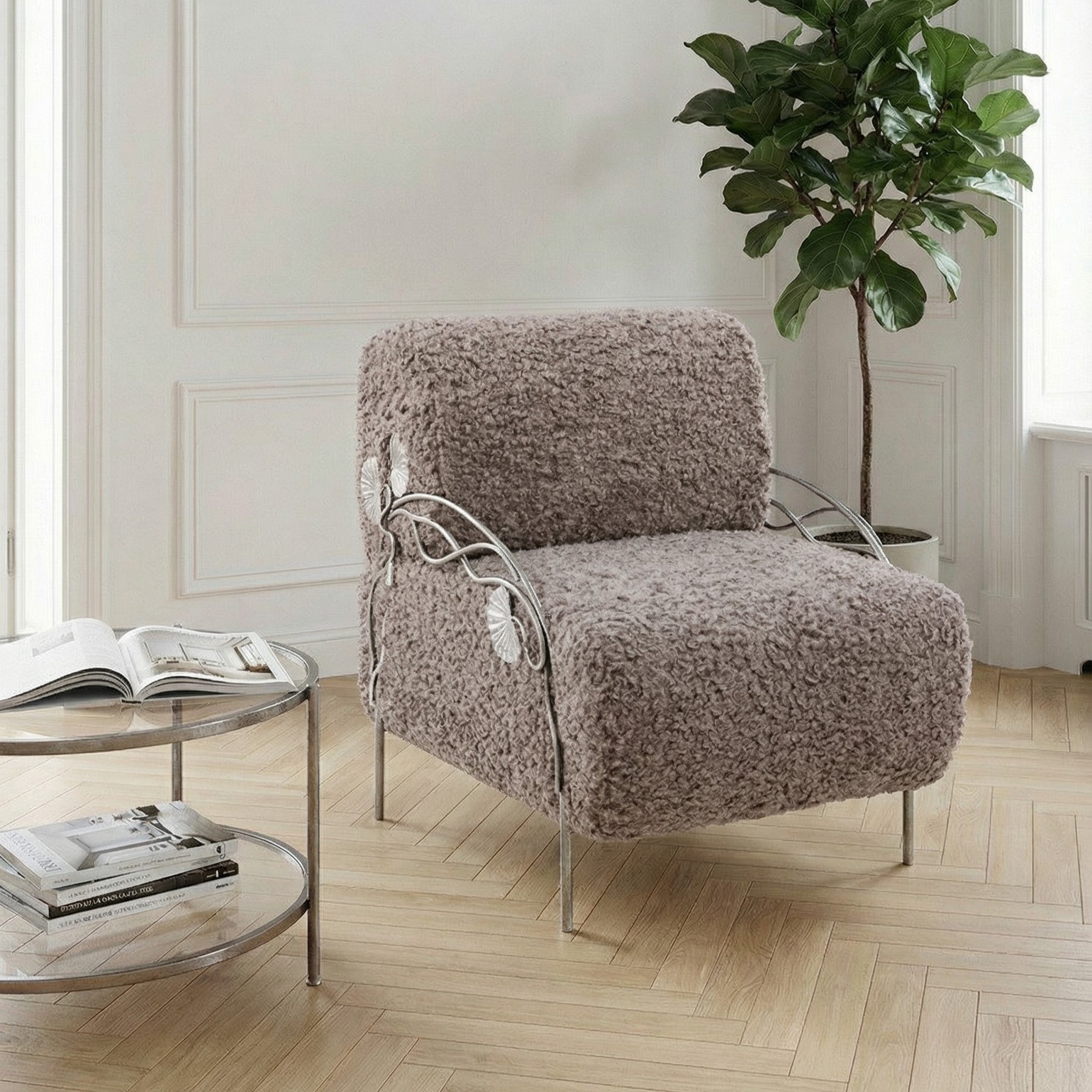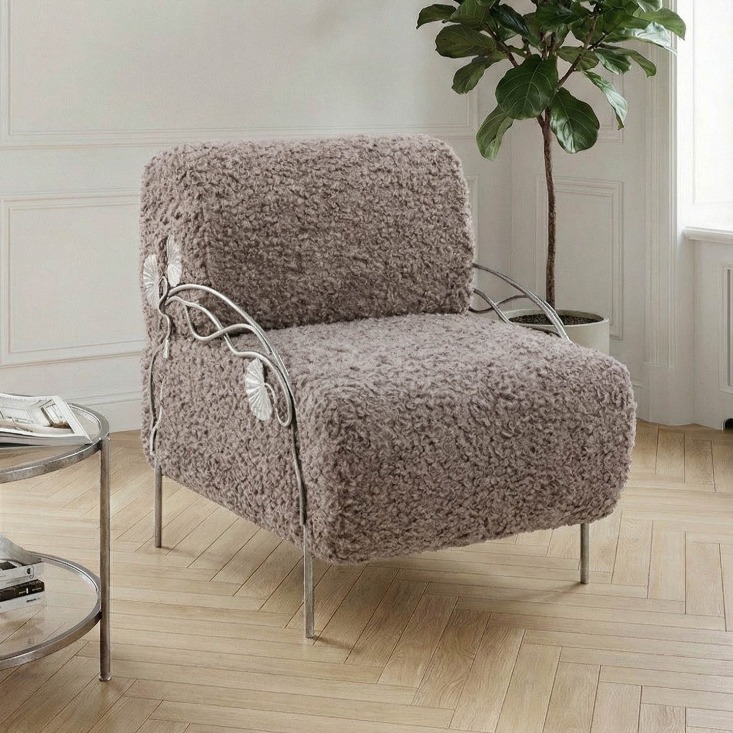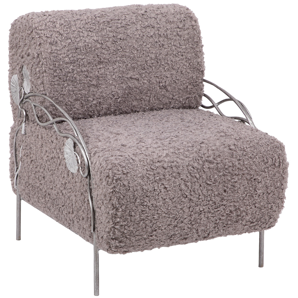 Кресло «Нимфея» – изысканная деталь интерьера для тех, кто ценит комфорт и роскошь.Модель выполнена из прочной кованой стали и отделана мягкой мебельной тканью с добавлением искусственного меха. Такое сочетание делает кресло не только декоративным акцентом, но и по-настоящему уютным местом для отдыха. Элегантная цветовая палитра в тоне какао и благородное серебристое патинирование подчёркивают уникальную ручную работу мастеров. «Нимфея» гармонично вписывается в классические и современные интерьеры, дополняя гостиную, спальню или зону отдыха выразительным премиум-акцентом. Преимущества модели: Прочная база из кованой стали — долговечность и устойчивость Мягкая мебельная ткань с искусственным мехом — максимальный комфорт Авторская отделка в стиле — подчеркнутая премиальность Универсальный дизайн, подходящий для интерьеров класса люкс Кресло Нимфея — идеальное решение для создания атмосферы уюта и эксклюзивности в вашем доме.