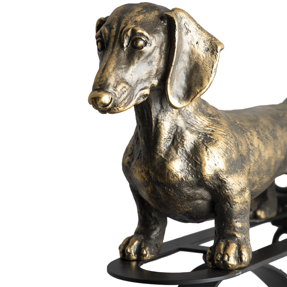 КачествоФигурка таксы выполнена вручную мастерами «BOGACHO» из композитного материала - Grs (glass reinforced composite – армированный стеклокомпозит), основу которого составляет стекловолокно нового поколения в соединении с полиэфирными смолами французского производства. Кронштейн выполнен из кованой стали.