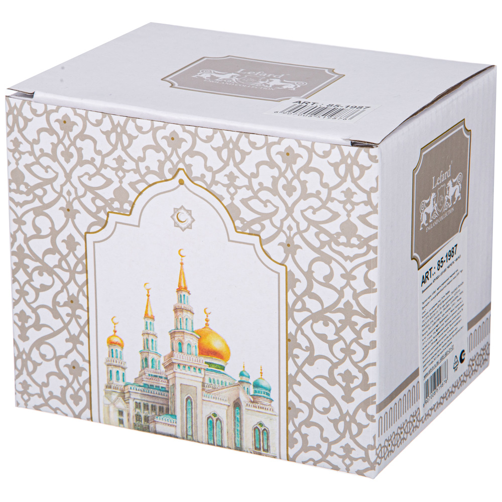 ТМ LEFARD представляет эксклюзивную коллекцию посуды «МЕЧЕТЬ». Кружки, чайные пары, наборы чайных пар, декоративные тарелки выполнены из высококачественного тонкостенного фарфора. При участии служителей Московской соборной мечети, одной из самых крупных в Европе, создана эта великолепная и торжественная коллекция. Восточный орнамент, изображение мечети, транскрипция Сур из Корана на кириллице, история Московской соборной мечети в нескольких любимых мусульманами цветах с отделкой золотом украшают изделия. Каждое изделие упаковано в цветную или подарочную коробки. Это прекрасный мусульманский подарок, всегда нужный и теплый. Относитесь к нему бережно и с почтением. Посуду коллекции можно использовать как в повседневной жизни, так и на торжественном приеме. Не рекомендуется мыть в посудомоечной машине и использовать в микроволновой печи.