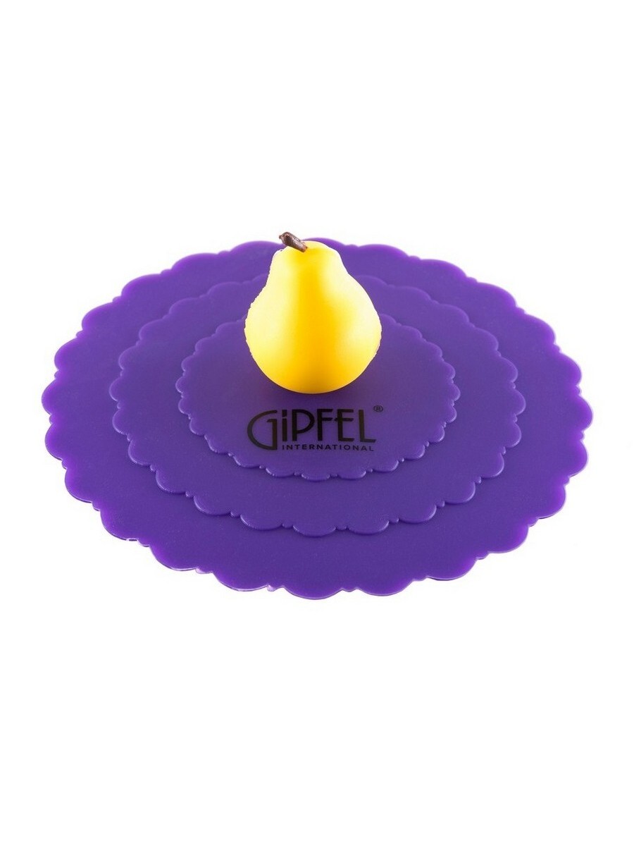 Крышка для чашки Gipfel 2899. Диаметр крышки 12 см, высота - 3 см. Крышка фиолетового цвета украшена сверху яркой силиконовой грушей. Крышка сделана из пищевого силикона и используется для сохранения напитка в чашке горячим, также с помощью нее можно заваривать чай прямо в чашке. Крышка очень плотно прилегает к ободу чашки, чтобы ее открыть, приподнимите ее за край.