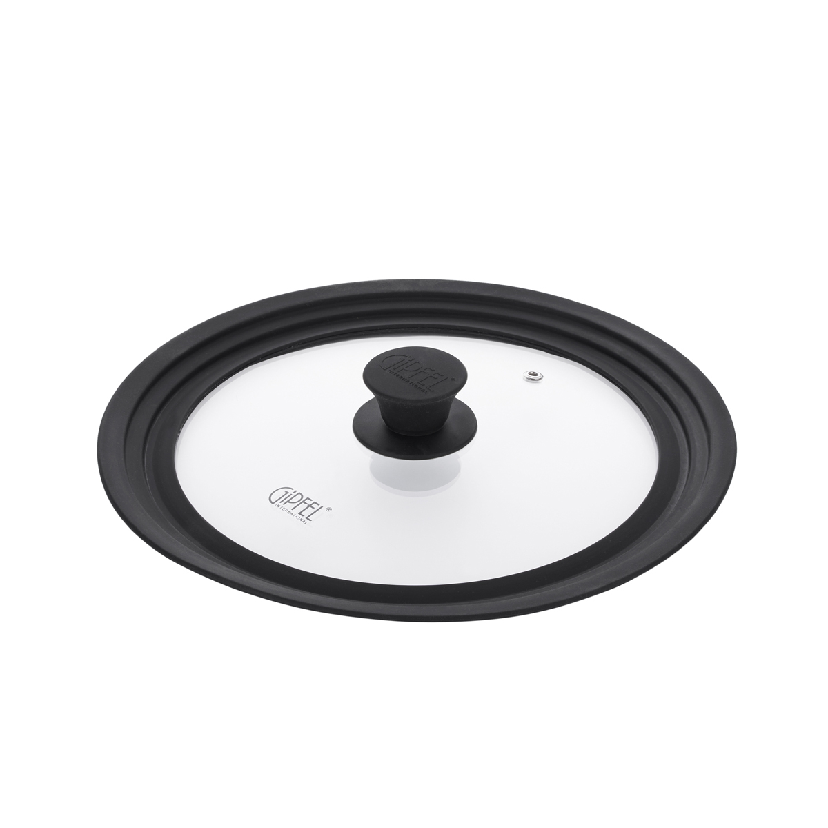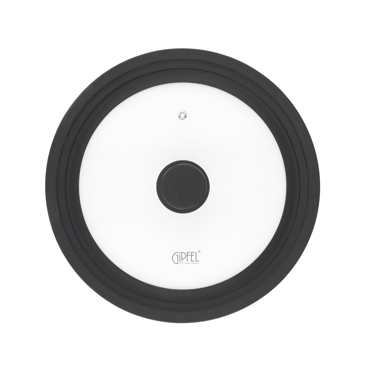 Крышка Gipfel Ambassador 50433 стеклянная на 3 размера 24/26/28 см с силиконовым ободом. Материал: закаленное стекло, силикон, нержавеющая сталь 18/8. Цвет: черный.