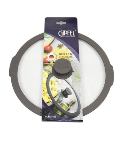 Крышка стеклянная GIPFEL ANETTA 1041 с силиконовым ободом и силиконовой ручкой. Диаметр крышки 24 см. Крышка сделана из закаленного стекла толщиной 4 мм. Крышка имеет силиконовый обод черного цвета, что делает ее пригодной для использования с любой посудой, даже имеющей антипригарное покрытие: она не поцарапает края и при этом будет плотно прилегать. У крышки с двух сторон имеется рифленая поверхность для упора большими пальцами, если вам нужно, например, слить из кастрюли воду. Также имеется отверстие для удобного слива.