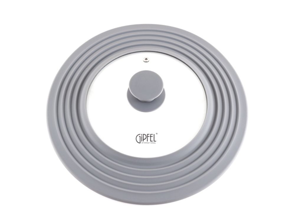 Крышка Gipfel GIUM 1044. Выполнена из закаленного стекла и имеет силиконовый обод, рассчитанный на пять размеров посуды. Универсальная крышка подойдет для кастрюль и сковород диаметром 20,22,24,26,28 см. Силиконовая ручка серого цвета не нагревается в процессе приготовления. Крышка оснащена отверстием для выпуска пара из нержавеющей стали 18/8.