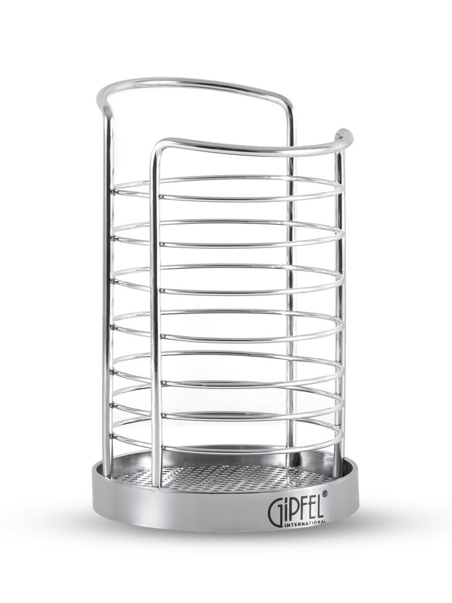 Подставка настольная для хранения кухонных аксессуаров GIPFEL 5183. Подставка цилиндрической формы выполнена из прутьев хромированной углеродистой стали. Она поможет организовать пространство на столешнице, в ней можно хранить мелкие кухонные инструменты и аксессуары. Размер подставки10х16см.