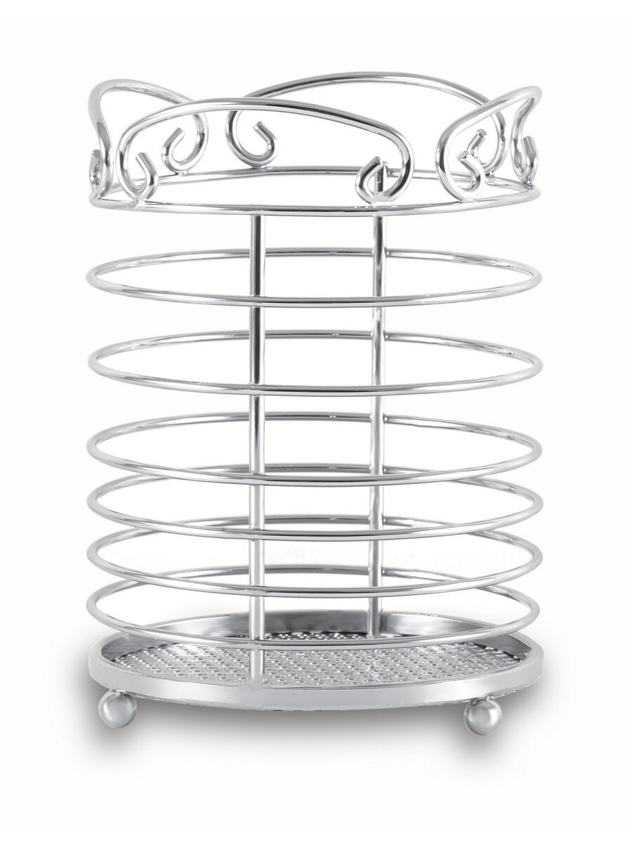 Подставка настольная для хранения кухонных аксессуаров GIPFEL 5186. Подставка имеет цилиндрическую форму, сформированную стальными прутьями. Размер 10,5х14,5 см. Сделана из хромированной углеродистой стали. В ней можно хранить кухонные аксессуары, лопаточки, шумовки, половники, овощечистки, силиконовые кисточки или предметы сервировки.