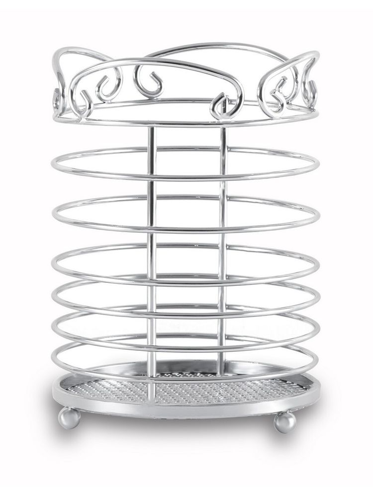 Подставка настольная для хранения кухонных аксессуаров Gipfel 5186. Подставка имеет цилиндрическую форму, сформированную стальными прутьями. Размер 10,5х14,5 см. Сделана из хромированной углеродистой стали. В ней можно хранить кухонные аксессуары, лопаточки, шумовки, половники, овощечистки, силиконовые кисточки или предметы сервировки.