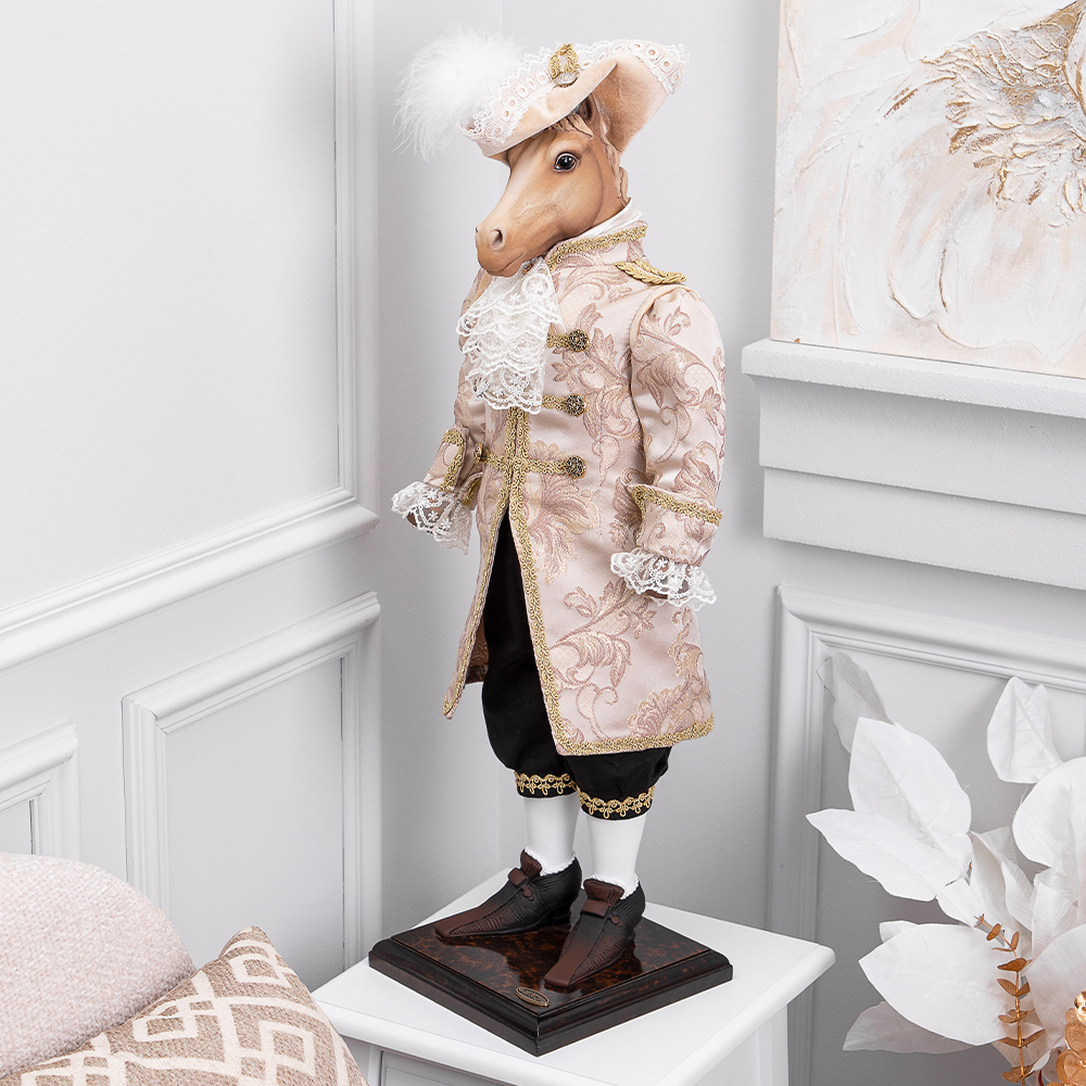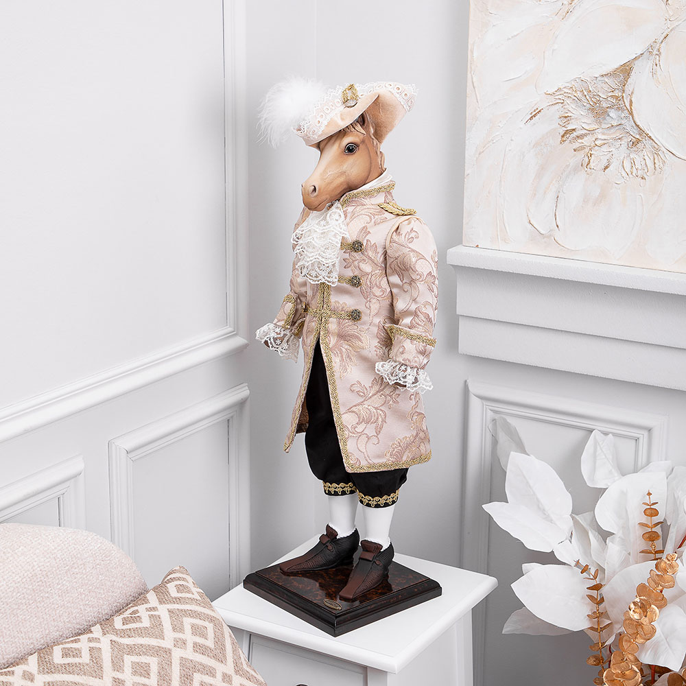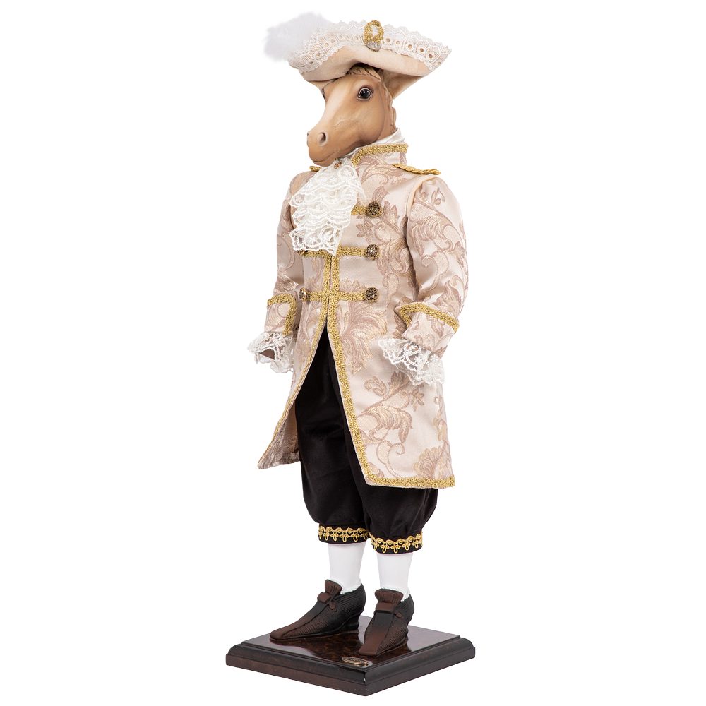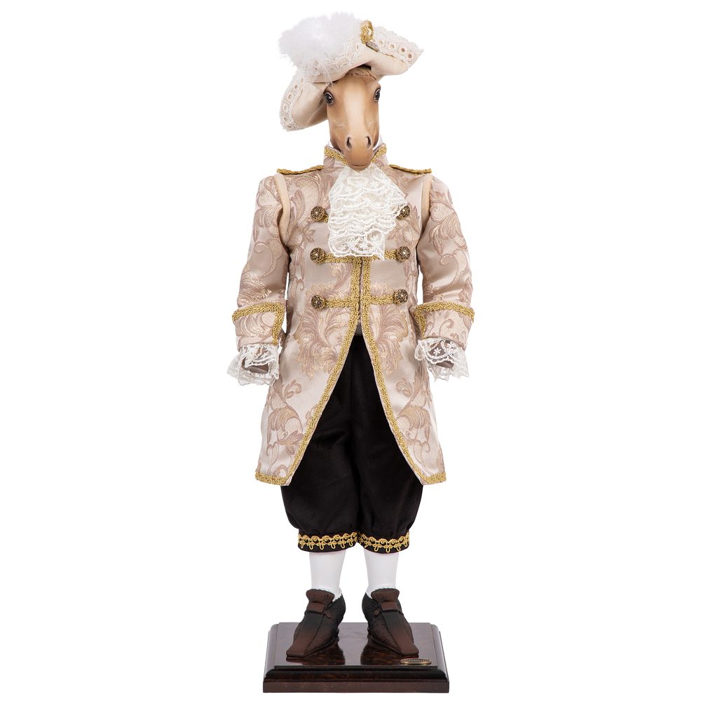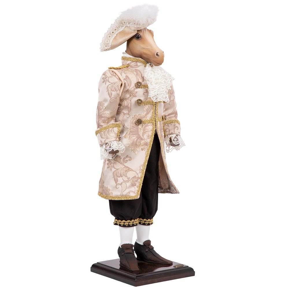 «Аристократ» – воплощение безупречного вкуса и вековых традиций. Эта коллекционная кукла представляет собой статного жеребца в изысканном костюме с элегантной шляпой, где каждая деталь подчеркивает его благородное происхождение. Строгие линии, дорогие материалы и безупречные пропорции создают образ истинного джентльмена.
