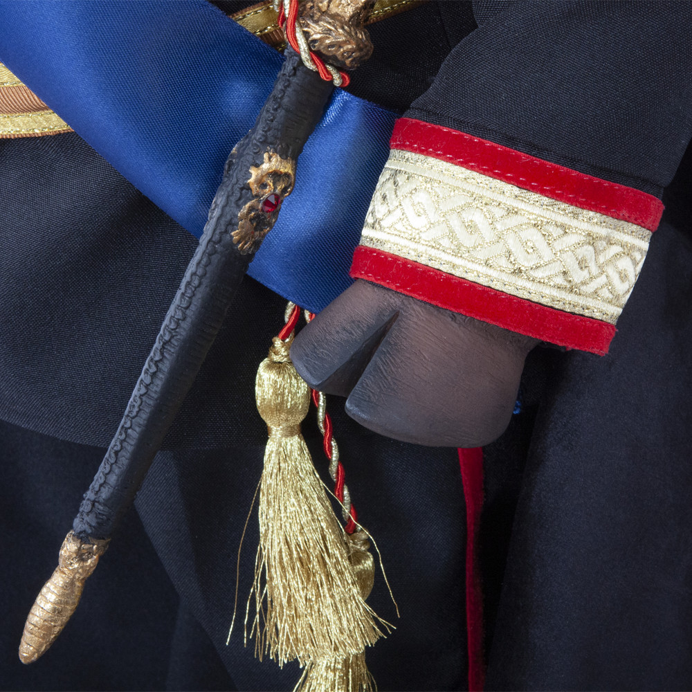 2. Одежда:- костюм: габардин,- плащ: бархат Того, искусственный мех под натуральную каракульчу- лента: атлас,- декоративная золотая тесьма
